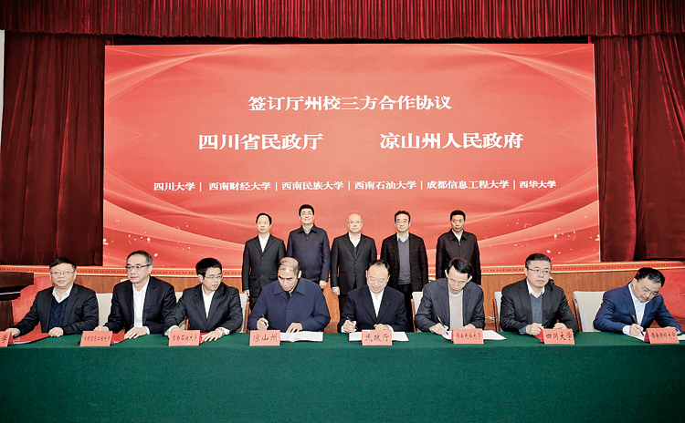 王正谱,林书成,苏嘎尔布,益西达瓦,四川大学党委常委、副校长侯太平共同为“彝路相伴”形象标识揭幕。四川省民政厅与四川大学、西南财经大学、西南民族大学、西南石油大学、悟空官方网站、西华大学6所高校签署了合作协议。