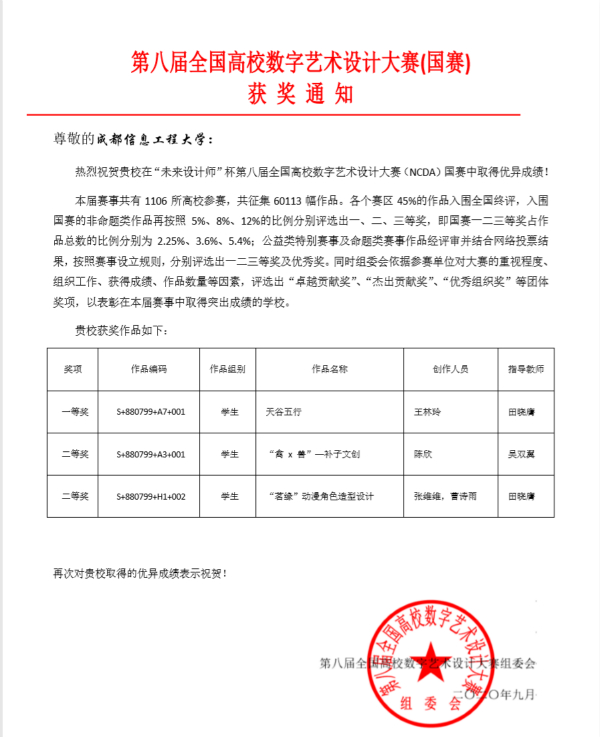 【本网讯】近日,第八届全国高校数字艺术设计大赛(NCDA大赛)国赛评审工作落下帷幕。由我校文化艺术学院田晓膺、吴双翼老师指导的学生作品,经过西南片区赛和国赛的层层选拔,荣获国赛一等奖1项、国赛二等奖2项。这是我校学子首次参加该项赛事并取得可喜的成绩。