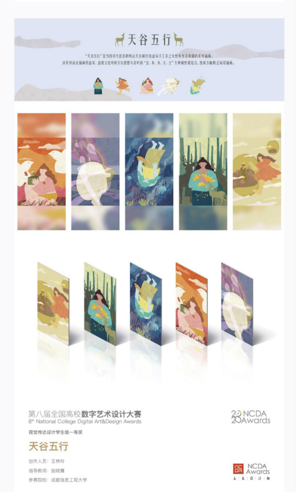 大赛共有来自全国的1106所本科和专科高校报名参赛,其中包括北京大学、浙江大学、中央美术学院、中国美术学院、四川大学、四川美术学院等国内知名高校,共征集作品60113幅,得到中共中央宣传部“学习强国”学习平台、中国教育报、人民网等权威媒体的报道。我校文化艺术学院视觉传达设计专业2020级学生王林铃作品《天谷五行》(指导教师:田晓膺)荣获国赛一等奖,并在“学习强国”学习平台进行展示。