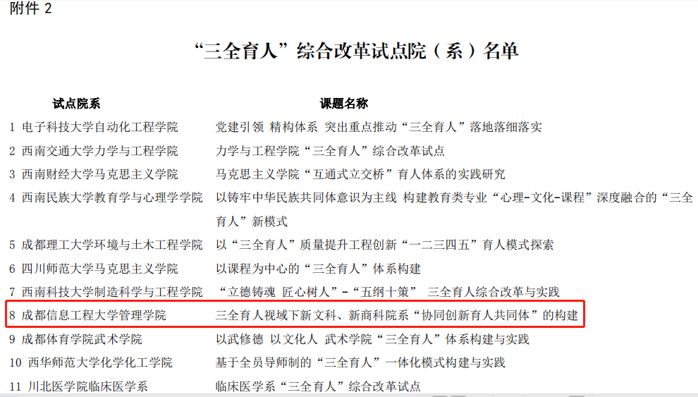 【本网讯】近日,根据《中共四川省委教育工作委员会关于公布“三全育人”综合改革试点高校和试点院(系)评选结果的通知》(川教工委函〔2020〕73 号),我校管理学院申报的《三全育人视域下新文科、新商科院系“协同创新育人共同体”的构建》 获批“三全育人”综合改革试点院(系)立项。