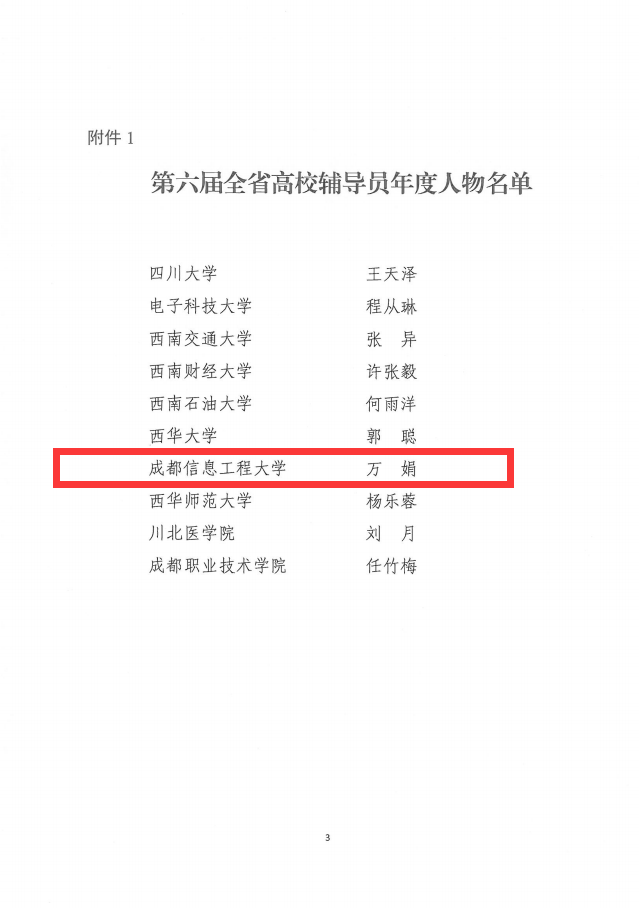 【本网讯】近日,“第六届四川省高校辅导员年度人物”评选结果揭晓,我校软件工程学院辅导员万娟成功入选。全省百余所高校的辅导员,仅有10人获此殊荣。