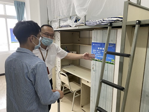 在临时隔离点,体温异常的同学经过测温、消毒,进入隔离入住点,隔离点工作人员对被隔离的学生进行了疫情防控知识的宣传和安抚,并带领学生到隔离室,详细介绍了入住期间的注意事项。每间隔离室都铺好了干净整洁的床品,悬挂了蚊帐,准备了毛巾、纸巾、牙刷,房间内有空调、饮水机,房间外放有椅子,以便隔离期间取放餐食。