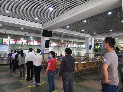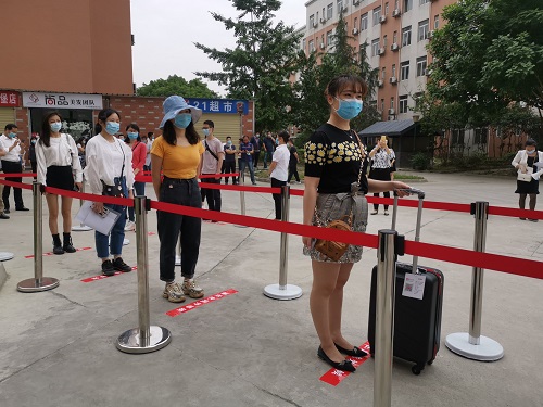 在航空港校区正大门,为了避免报到时学生聚集,学校在大门外设置了休息帐篷、临时观察帐篷并安排了应急车,学生在正大门等候区经过体温检测人员对其手部、鞋底、行李消毒,进行身份认证登记后进入“3D护学门禁”,(该门禁系统使用三维人脸识别技术+热成像测温技术,可以戴着口罩识别,风险低,准确度高,防伪能力超强,仅当人脸识别成功、温度正常时闸机才放行通过)体温正常学生进入校内,体温异常的同学则被带到临时留观处,医务人员完成规定的检查后,由防疫专用车辆,开往发热临时处置室。