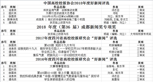 【本网讯】近日,校报好新闻评选结果陆续揭晓,我校《悟空官方网站报》参评的作品获得多个奖项。其中,5项作品获得中国高校校报协会2018年度好新闻奖(二等奖4项、三等奖1项),1项作品获得2018年度(第36届)成都新闻奖专项奖,4项作品获得2017年度四川省高校校报研究会“好新闻”(一等奖1项、三等奖3项),5项作品获得2016年度四川省高校校报研究会“好新闻”(一等奖3项、二等奖1项、三等奖1项)。