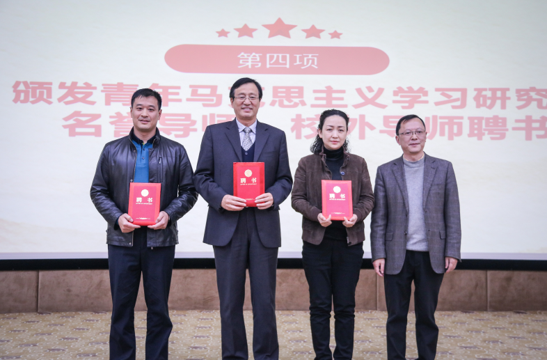 在热烈的掌声中,陶若铭、袁森为“青年马克思主义学习研究会”揭牌。随后,陶若铭为阎钢、张海霞、肖力芥三位导师颁发名誉导师和校外导师聘书。