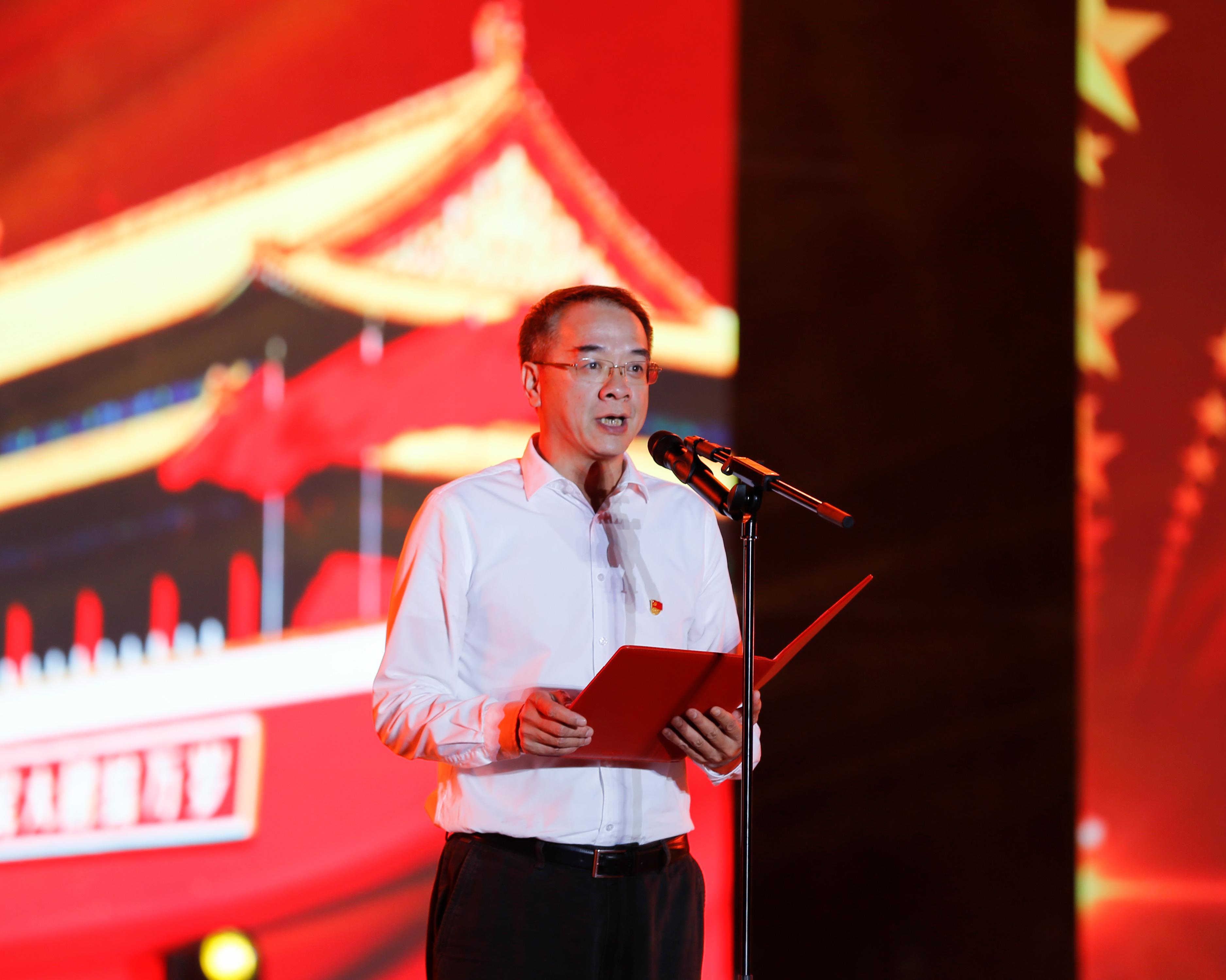 党委书记周激流代表学校党政向全体新生表示热烈的欢迎,向策划晚会的全体工作人员和学生志愿人员表示亲切慰问和衷心感谢,并与大家共同重温了共和国的发展历程,回顾了祖国及学校发展取得的成就。他勉励新同学,要常怀感恩之心,立定报国之志,厚植为民情怀,锤炼过硬本领,以大气的品格、乐观的心态、仁和的爱心和坚韧不拔的毅力,去经风雨、见世面,丰厚学识、追求真理、勇立潮头、奋力拼搏,把个人梦想融入实现民族复兴、人民幸福的宏伟事业,书写出绚丽多彩的壮丽人生。