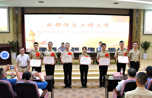 【本网讯】携笔从戎酬壮志,砺剑出征报家国。7月19日下午,学校在国际会议厅举行2019届国防生毕业欢送暨入伍出征仪式。学校党委常委、党委宣传部部长陶若铭,火箭军驻校选培办主任,学生工作处、招生就业处、保卫处、校团委负责人,毕业年级国防生培养学院党委书记、副书记,2019届毕业国防生参加了仪式。仪式由学生工作处副处长陈智勇主持。