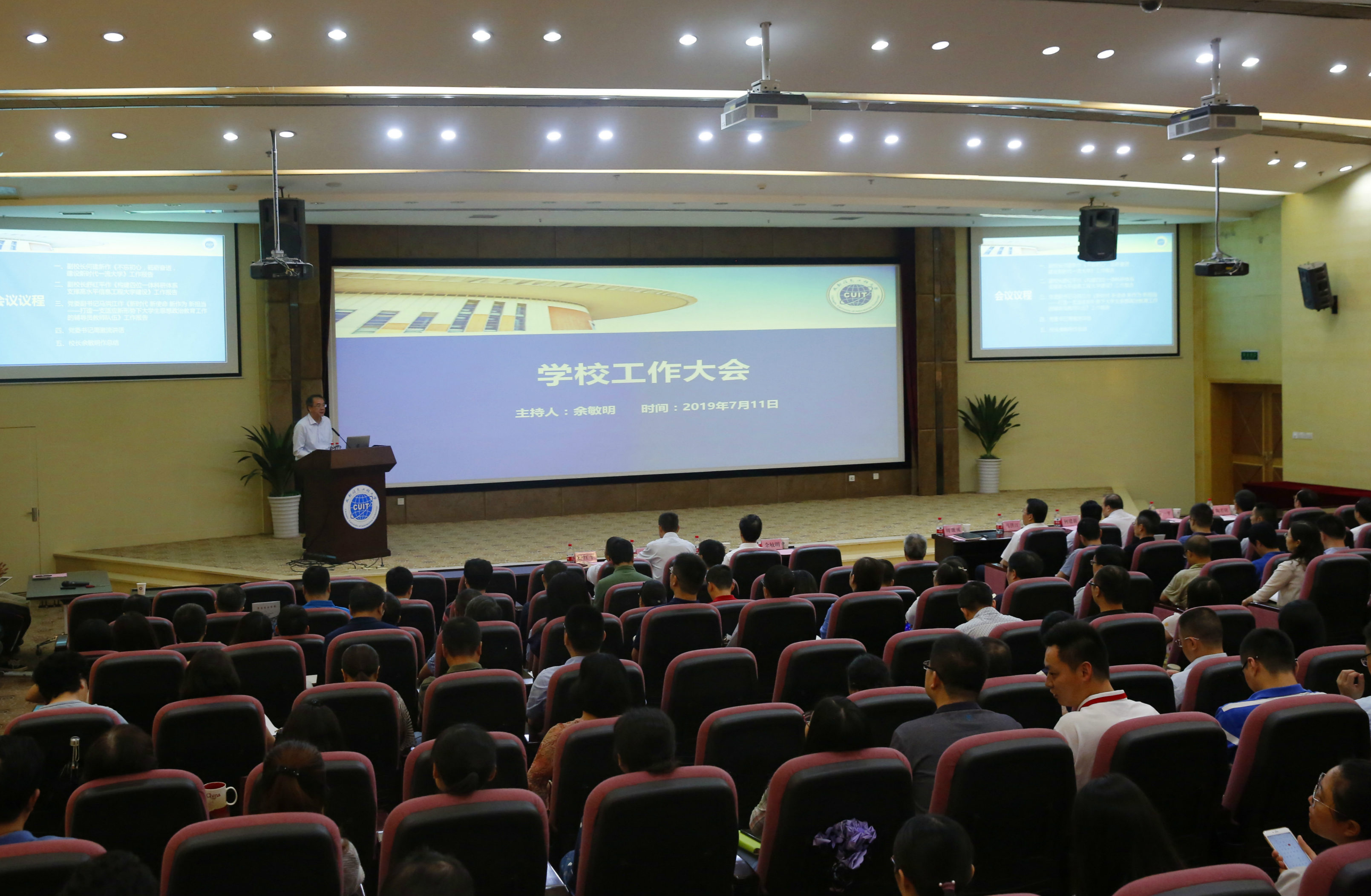 【本网讯】7月11日,学校工作大会在国际会议厅举行,中层以上干部参加了会议。会议由校长余敏明主持。