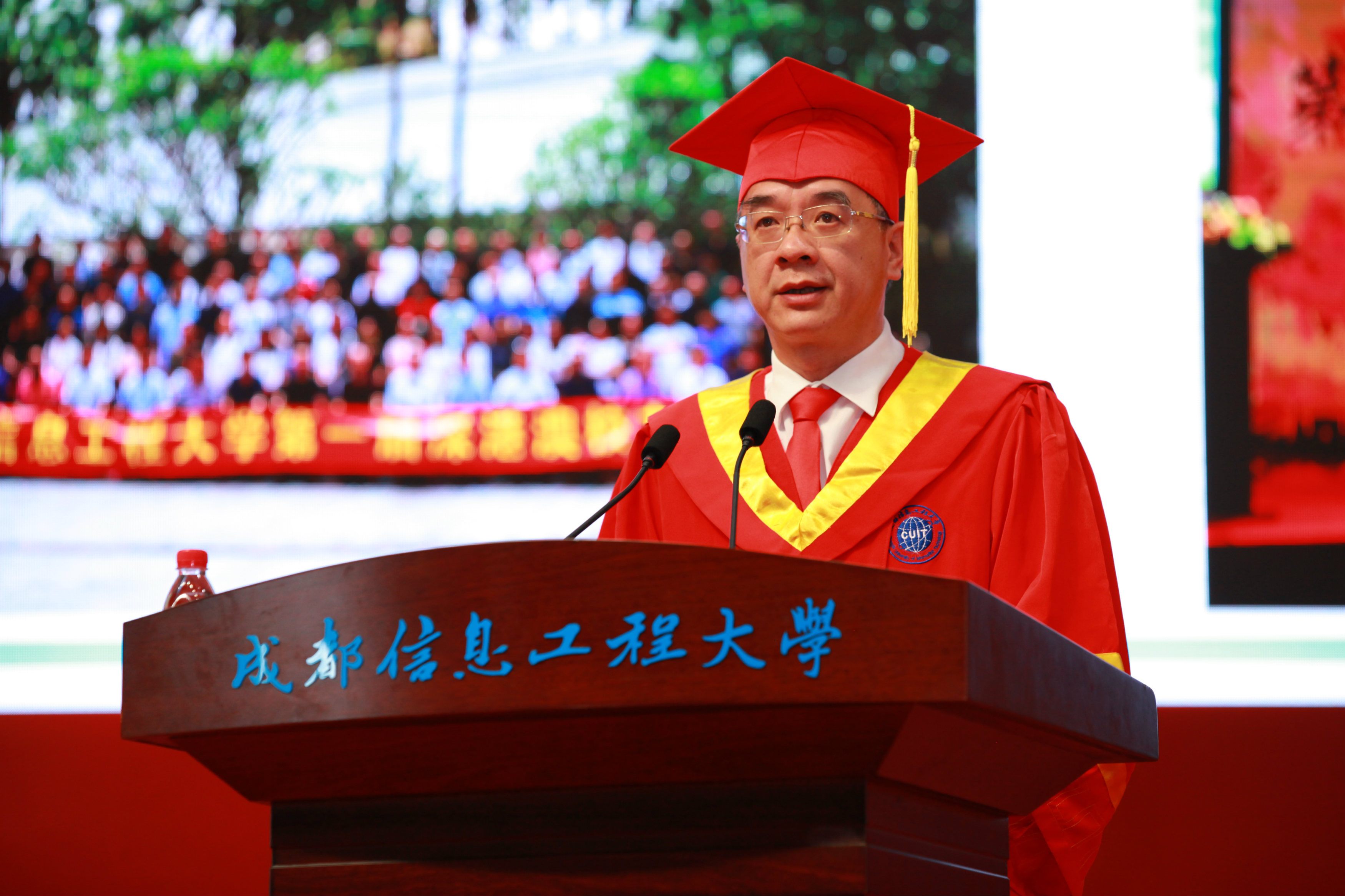 学校四川校友会会长、“思华助学基金”创始人、成都尊华投资(集团)有限公司董事长邓思华代表校友发言。他祝贺毕业生们完成了一段重要的人生历程,和毕业生一起重温了自己三十年前就读成信大(时为成都气象学院)的青春岁月,分享了自己就业、创业的心得体会。他希望毕业生在追逐梦想的过程中,学会感恩,珍惜当下;目标清晰,坚守初心;听从内心,顺应时代,努力创造无愧于时代、无愧于自己的精彩人生。