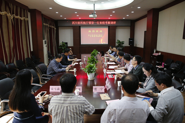 【本网讯】4月9日下午,四川省科技厅陈学华副厅长、基础研究处丰伟处长、高新处丁昭洋副处长来我校调研科研工作开展情况。学校校长余敏明、副校长舒红平热情接待了陈学华一行,并在行政楼第六会议室召开座谈会。会议由舒红平主持。