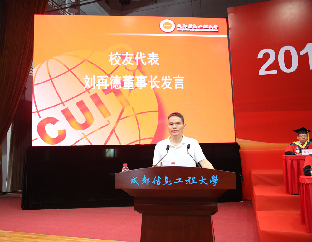 美国Syracuse大学计算机博士,现任天奇创投投资合伙人,硅谷科技协会联合创始人、副会长,学校82届杰出校友刘再德代表校友发言。他向毕业生们完成人生中重要的一段学业表示祝贺,并用自己的创业经历启迪同学们:不怕输在起跑线,就怕不起跑;世界为我们开了很多门,只要努力,一切皆有可能。他指出,大学学习不是方程而是方法;大学毕业不仅是一个学习的结束,也是另一个学习的开始。在分享了企业家乔布斯名言“stay hungry, stay foolish”之后,他寄语成信大毕业生“求知若饥,虚心若愚,勇敢自信,健康一生(stay hungry, stay foolish, stay brave, stay healthy)”,在人生的道路上越走越精彩。