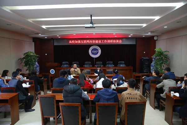 调研人员根据调研内容与我校师生代表围绕互联网平台建设,大学生网络语言和行为等方面进行了座谈。
