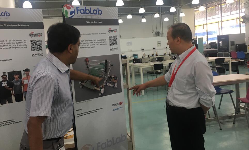 会后,我校代表参观了新加坡理工学院Fab Lab(Fabrication Laboratory)创新实验室,该实验室是由美国麻省理工学院(Massachusettes Institute of Technology,MIT)比特和原子研究中心(Center for Bits and Atoms,CBA)发起的,旨在围绕创新2.0探索创新模式。目前,Fab Lab在全球已经建立700多个创新实验室。工程学院副院长Sudhir介绍了Fab Lab中开展的创新项目,并展示了学生的创新作品。