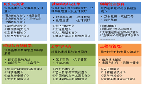六个课程领域中,“历史与文化、社会科学与法律、创新创业教育”三个领域,是为了培养学生基本的人文素养、全球意识与社会科学视野、法律与伦理意识及全球视野、创新意识与创新创业能力等通识能力,满足全校所有学生综合素质培养的需要。“哲学与自然科学、艺术与审美”课程领域是为了实现不同学科门类学生知识领域的互补。“工程与管理”领域是基于我校学科专业特点,体现信息科学与管理科学交叉融合,培养学生跨学科交流能力。此外,每一课程领域中,学校都设置了有能满足全体学生通识教育需求的核心通识课程,也设置了能满足学生个性化发展需求的通识课程。此次学校通识教育改革的实施,将有效促进通识教育效果的提升。