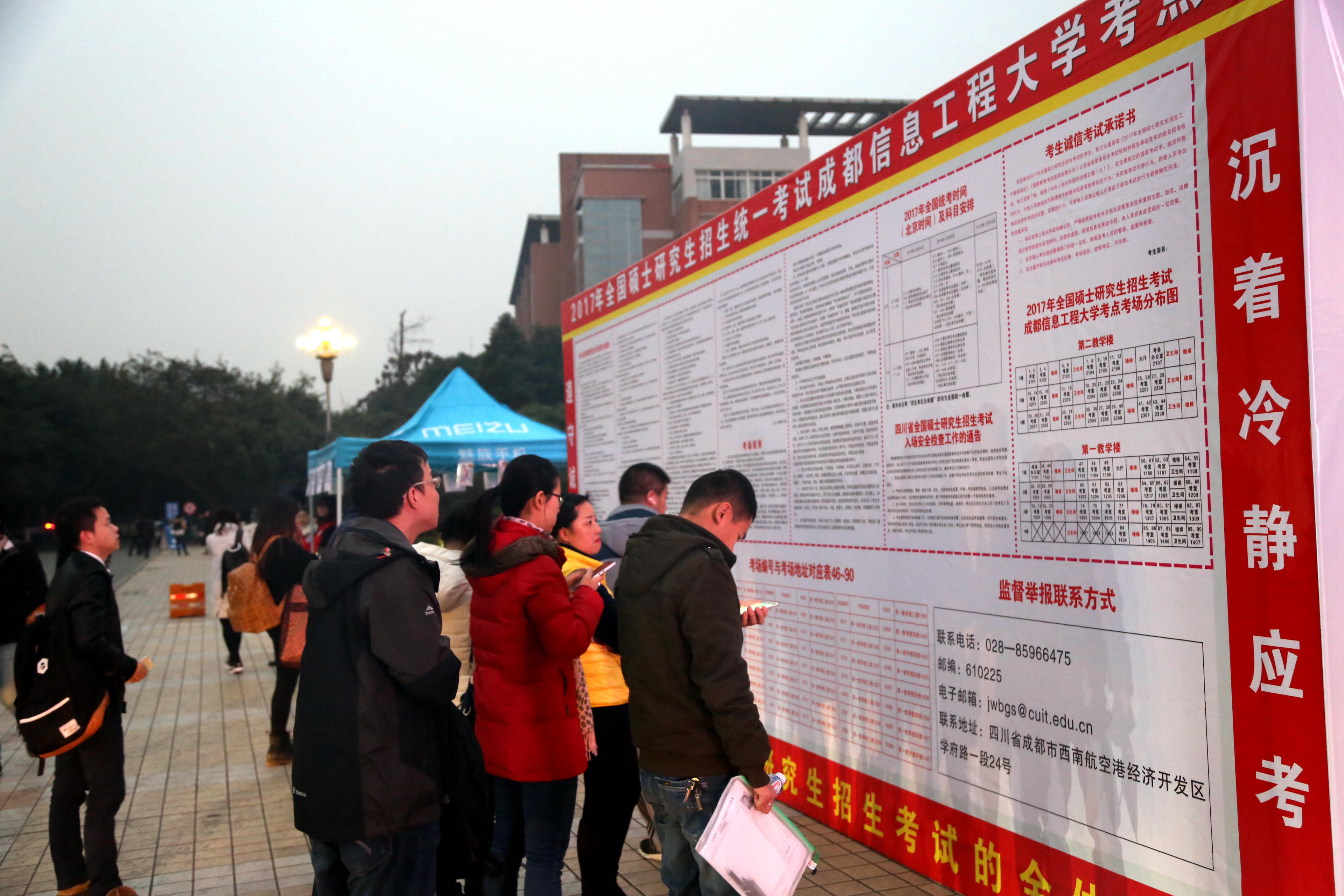 据研究生处负责人介绍,此次考试全部安排在标准化考场举行,考场内外指示标牌、安全线标注醒目,设置了身份证扫描仪、指纹识别仪、金属探测器、手机信号屏蔽设备等用来防范作弊,并设置考试视频监控中心对所有考场进行实时监控。经过研究生处、党政办公室、党委宣传部、纪委办公室、学生处、保卫处、教务处、后勤处、校团委等各单位的精心组织和分工协作,考试首日整个考点秩序井然。
