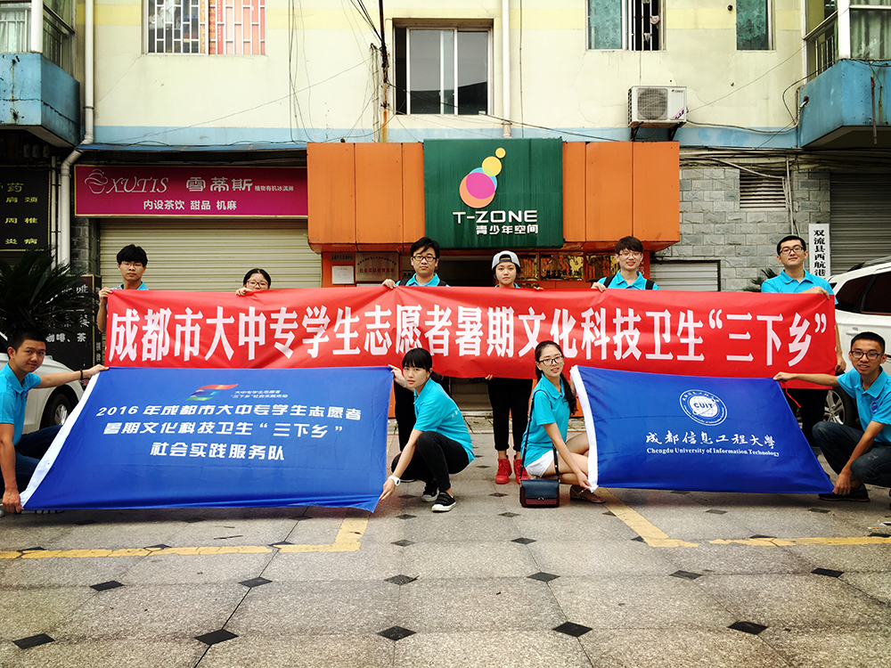 2016年暑期,我校按照中宣部、中央文明办、教育部、共青团中央、全国学联等联合部署,以“青春建功十三五·携手共筑中国梦”为主题,广泛开展了大学生暑期“三下乡”社会实践活动。学校集中组织了2000余名师生,186支社会实践团队,其中包括3支市级重点团队、15支校级重点分队、100多支院级重点小分队,赴全国各地开展了践行社会主义核心价值观、国情社情观察、精准扶贫、气象科普、科技支农、教育关爱、文艺服务、爱心医疗等专项社会实践活动,取得了良好的社会效应,得到了大量媒体的关注。其中,由我校学生会及部分学院学生会骨干组成的悟空官方网站“践行社会主义核心价值观”志愿者服务队,赴双流区湖夹滩街道等地针对留守儿童开展了爱心支教、敬老帮困、“践行社会主义核心价值观”宣传教育等多项活动,展现了成信学子良好的精神风貌,得到了当地政府和群众的一致好评。同时,各实践团队结合自身专业开展多项社会实践调查活动,在专业教师的指导下形成了多个社会实践调查成果,为政府基层治理政策的制定提供了重要参考依据。