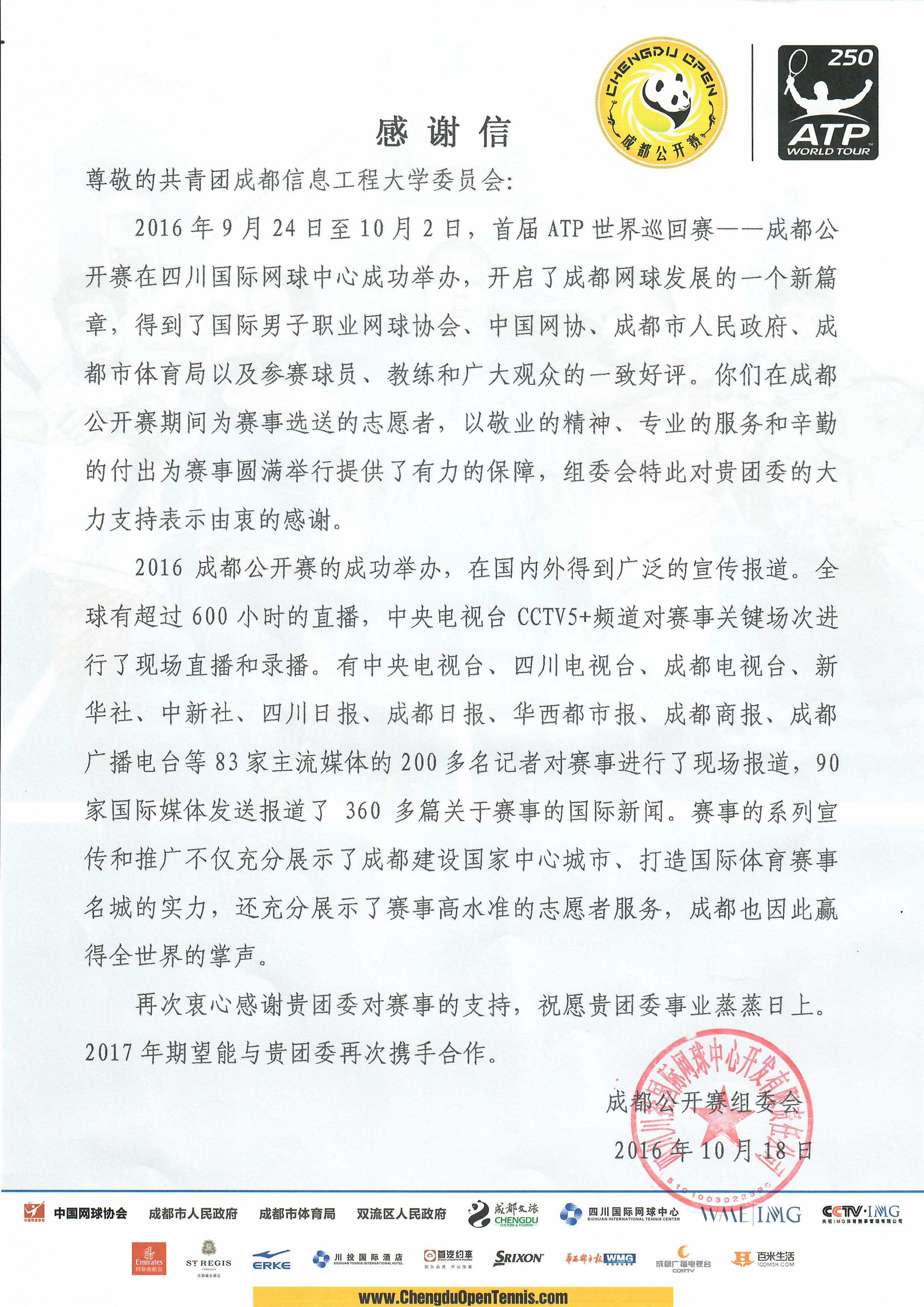 【本网讯】日前,首届ATP 世界巡回赛——成都公开赛组委会给我校发来感谢信,感谢我校为本届赛事的成功举办所提供的巨大帮助和支持,向我校参与赛事服务的志愿者们表达崇高的敬意和由衷的感谢,并对我校高效、规范、专业的志愿服务组织工作以及志愿者们的突出表现给予了高度评价。