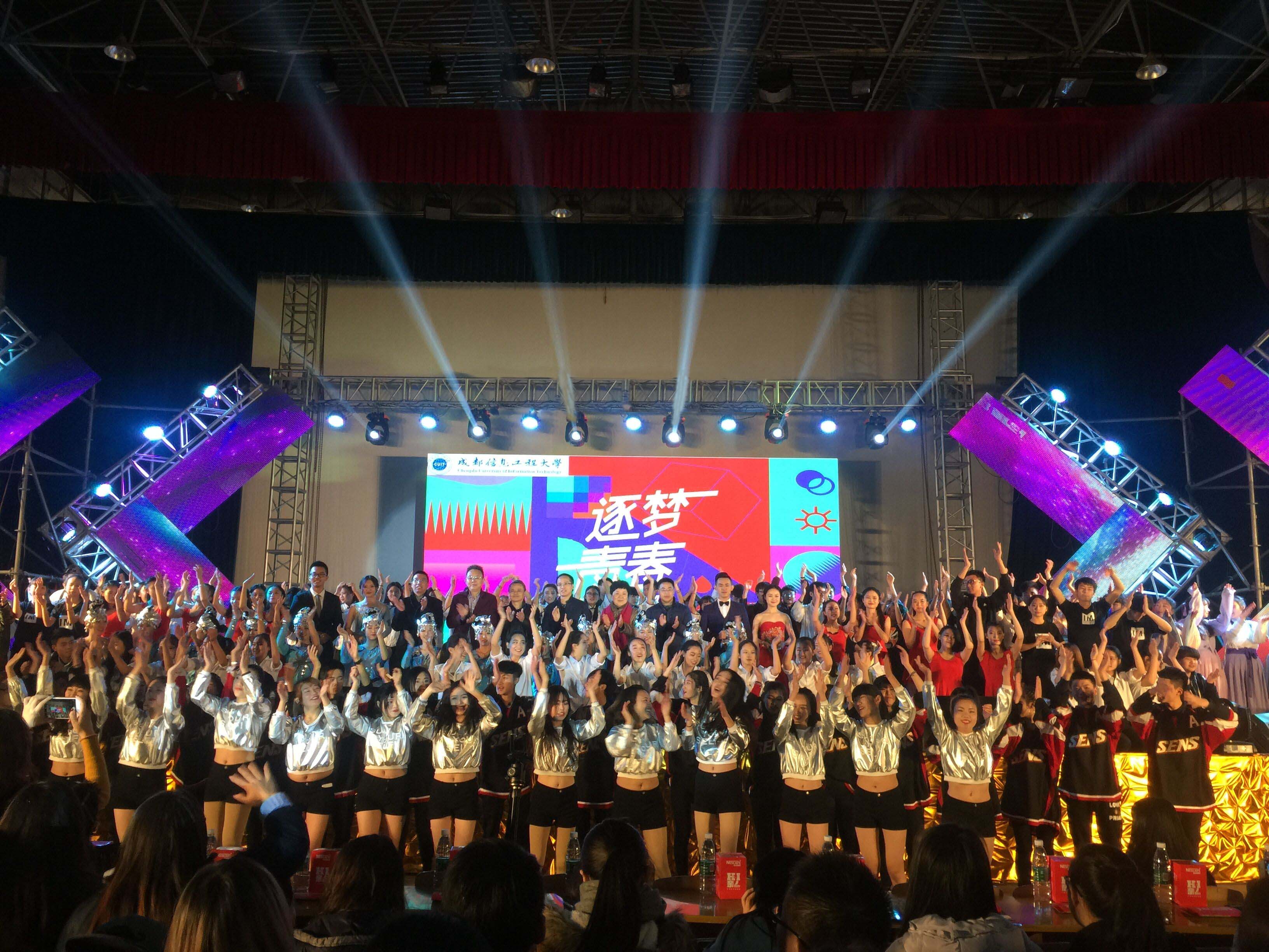 龙泉校区迎新晚会围绕主题“逐梦青春”,分为梦想花开、追梦无悔、放飞梦想三个篇章,由大学生艺术团、学生街舞协会、各学院为2016级新生献上了现代舞《舞动成信》、《木槿花开》,传统文化表演《华夏有衣》、《跪羊图》,民族舞蹈《水姑娘》,交响乐演奏《贝加尔湖畔》,流行歌舞《GIVE IN TO ME》、《just believe》以及校团委李然老师与同学们合唱的歌曲串烧《我们的温柔》等十余个精彩纷呈的节目,得到了同学们的广泛好评。此次晚会还将当今流行的电子音乐融入其中,让同学们感受到了别样的校园文化氛围。随着舞蹈《舞出我人生》,“逐梦青春”龙泉校区迎新生晚会划上圆满句号。