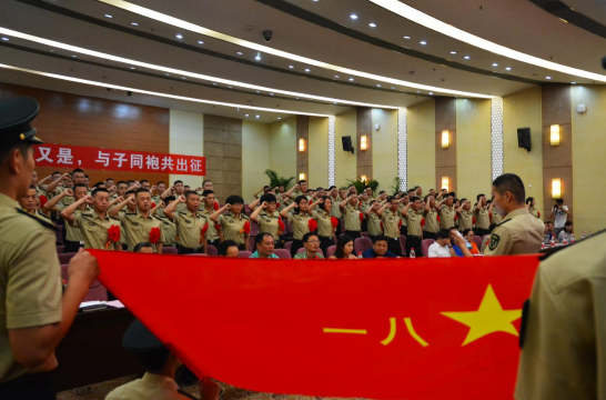 热烈的掌声过后,在国防生代表佘志松的带领下,109名毕业国防生面向“八一”军旗庄严宣誓,铿锵有力的誓言震彻现场。