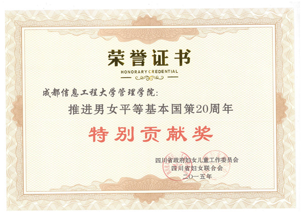 【本网讯】日前,四川省政府妇女儿童工作委员会、四川省妇女联合会联合发文,授予四川省人大内务司法委员会等291个单位、王飙等109名同志“推进男女平等基本国策二十周年特别贡献奖”荣誉称号,我校管理学院作为省级部门先进单位代表之一,获得“推进男女平等基本国策二十周年特别贡献奖”荣誉称号。