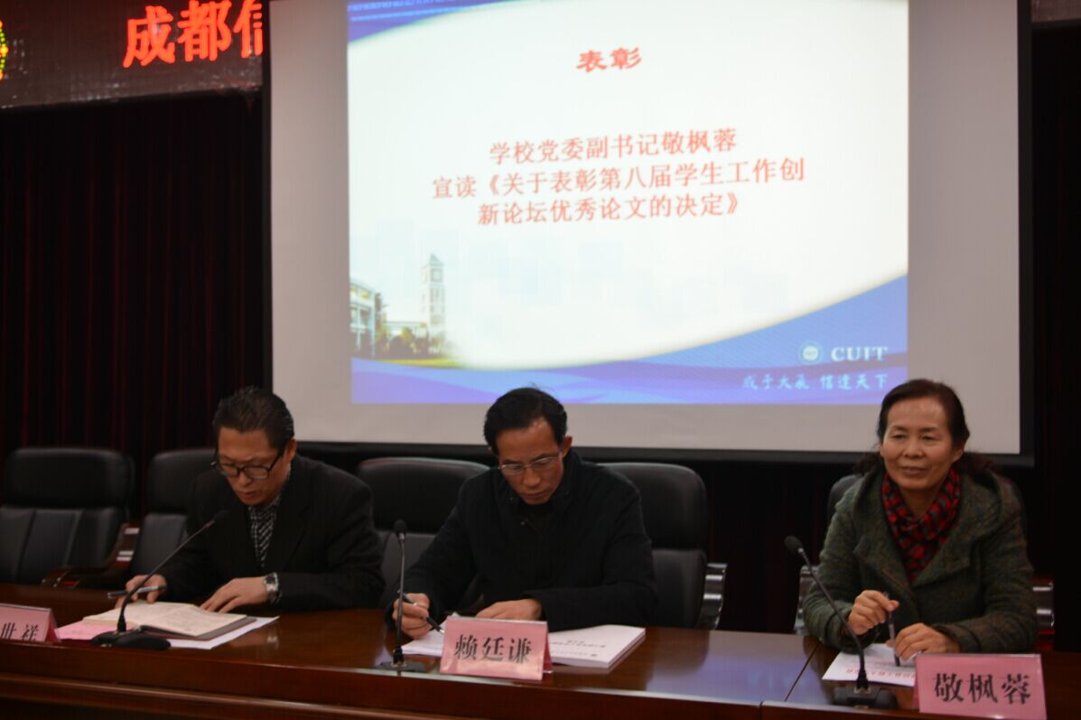 敬枫蓉宣读了《悟空官方网站关于表彰第八届学生工作创新论坛优秀论文的决定》。我校2015年第八届学生工作创新论坛共收到36篇论文,论文主题广泛、涉及面广,密切关注学生工作中的新现象、新情况,并提出了新的解决方案。大会对刘全等撰写的《基于大数据的我国人才市场对高校毕业生素质能力需求的分析》等11篇获奖论文给予了表彰。