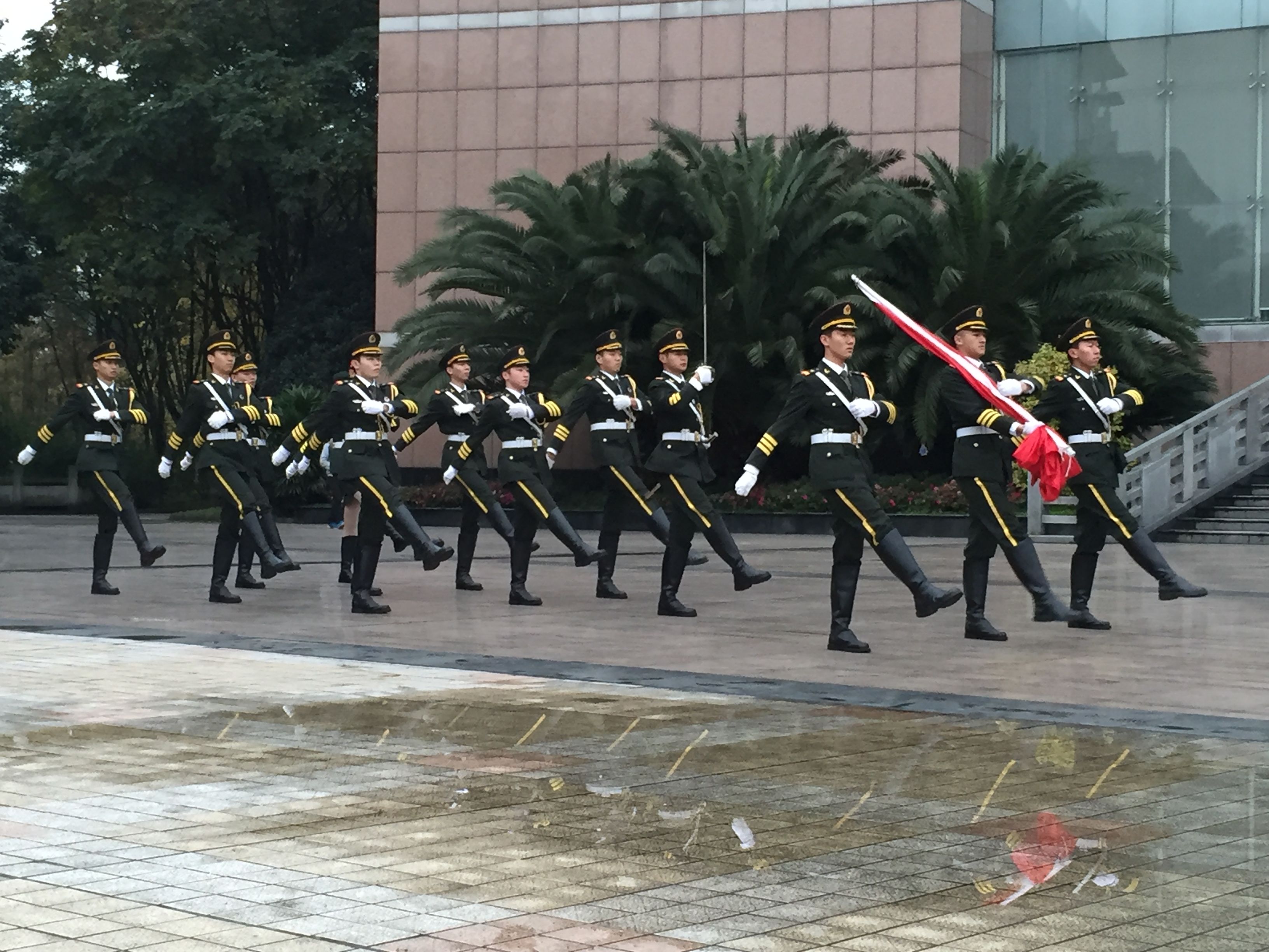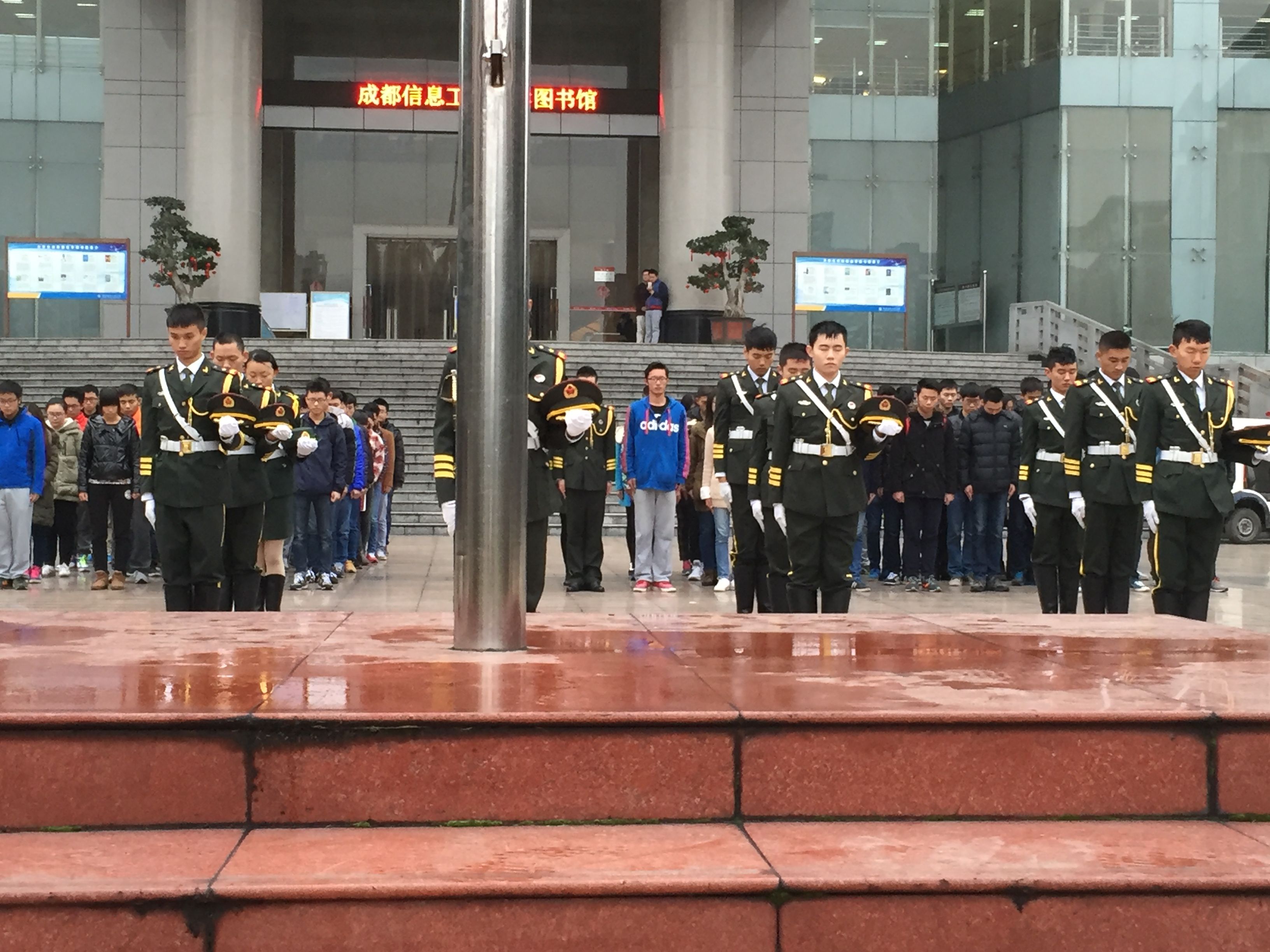 早晨天刚蒙蒙亮,我校国旗护卫队的队员们就在学校航空港校区图书馆前广场集结。约8时,仪式正式开始。随着国旗护卫队队长响亮的口令,队员们迈着整齐的步伐来到国旗台前。“升国旗,奏国歌!”洪亮的声音响彻耳边,国歌歌声随即划破天际。“敬礼!”队员们举手行标准军礼,目光紧随国旗缓缓移动。“礼毕!”紧随队长的又一道口令,队员们迅即立正;“脱帽,向南京大屠杀死难者默哀一分钟!”在国旗护卫队队长的主持下,默哀仪式开始,全体学生低头默哀。此刻,在场外围观的成信大学子们也受到感染加入到默哀的队伍中来。