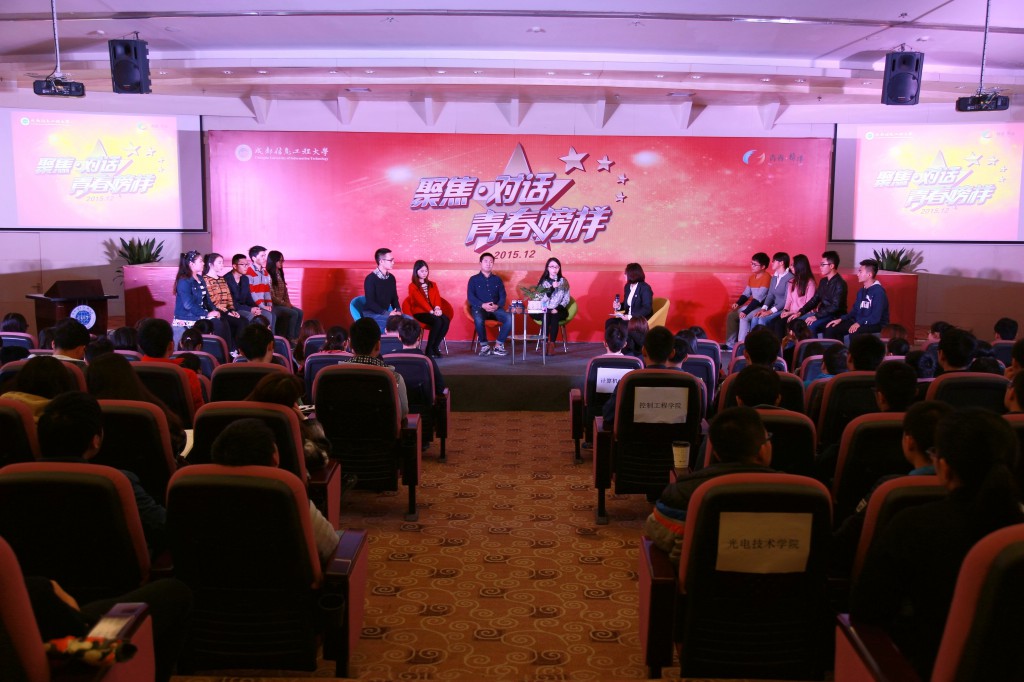 【本网讯】我校2015年度“聚焦·对话 青春榜样”宣讲会于2015年12月7日—12月10日在航空港校区国际会议厅和龙泉校区学术报告厅顺利举行,本次活动由学生工作处主办、计算机学院承办。本期聚焦·对话青春榜样共举办四场,航空港校区和龙泉校区各两场,学校副校长于世祥、学生工作处处长戴丽红、副处长潘光林、陈智勇以及部分学院党总支书记、全体辅导员、近1200名学生分别参加了本次活动。活动由控制工程学院辅导员田晓旭、信息安全工程学院辅导员何佩遥主持。