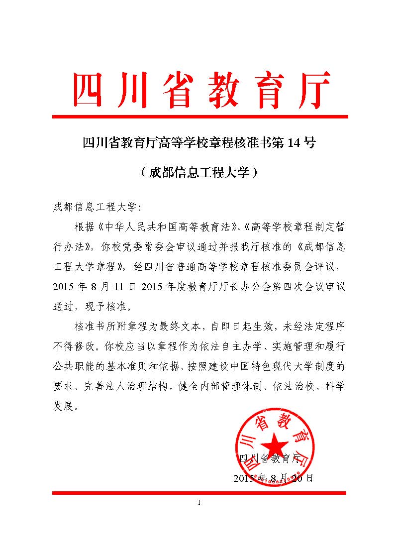 四川省教育厅高等学校章程核准书第14号---新闻链接:http://www.scedu.net/chushi/web/1440471865.shtml