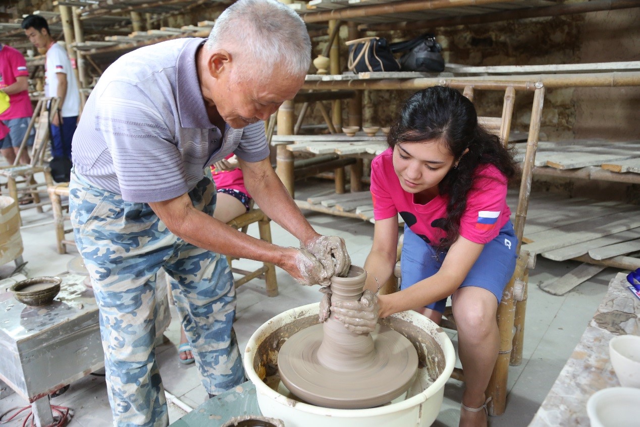 青年代表们参观了国际明月陶艺村,对其中的藏品赞不绝口。园区工作人员向代表们讲述了中国陶瓷发展史,介绍了古窑陶艺制作的技术特点和制作技巧,并在现场演示制作。在随后的体验环节,中俄青年们聚精会神,不时相互交流心得,最后均作出体现自我风格的作品。