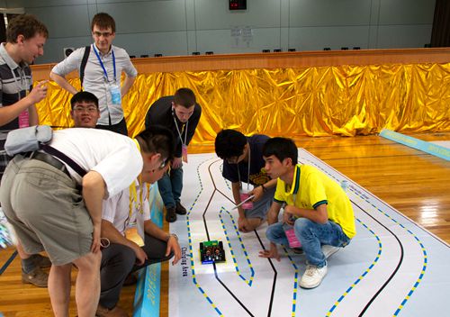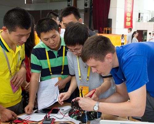 竞赛过程破除了学生国籍与学校的界限,随机组成了6个竞赛小组,每组成员5-6人。各小组通过协作共同完成一个工程性实践项目,项目涵盖了CDIO教育理念构思、设计、实施到运行的全过程。各小组学生在竞赛中结合光电传感器、线阵CCD传感器、信号采集处理、控制算法及执行、能量管理、电机驱动、转向舵机控制、蓝牙通信技术、无线充电技术、安卓APP交互与运行策略等技术,实现制作一个能够自主识别指定道路的模型汽车,按照规定路线行进,完成“投放、避障、无线充电、竞速”等赛事要求的任务。