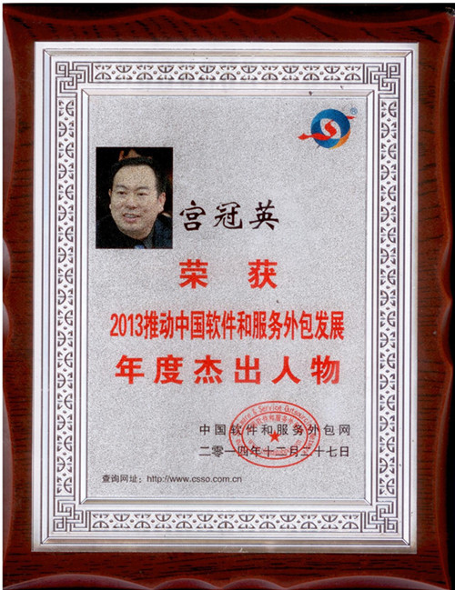 大会还特别举行了“发展--创新十年(2004-2014)中国软件和服务外包系列荣誉人物发布及颁奖”仪式。我院软件与服务外包学院院长宫冠英,因在残疾人服务外包人才培养中做出的杰出贡献,而荣获“2013推动中国软件与服务外包发展年度杰出人物”。