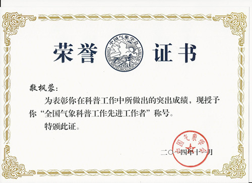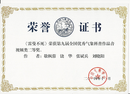 [本网讯]11月5日,中国气象学会第二十七届理事会对成都信息工程学院科普工作进行了表彰,授予成都信息工程学院“全国气象科普工作先进集体”称号,授予敬枫蓉同志“全国气象科普工作先进工作者”称号,同时我院创作的大型音乐科普剧《雷曼不死》(作者:敬枫蓉、饶华、张斌兵、刘晓阳)荣获第九届全国优秀气象科普作品音视频类二等奖,科普歌曲《风雨雷电,我梦追随》(作者:饶华、刘晓阳、吴泽)荣获第九届全国优秀气象科普作品音视频类三等奖。(来源:科技处 作者:汤志亚 审核:新闻中心)