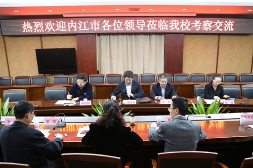 潘国华主要介绍了内江市目前的产业结构、产业发展的思路和正在实施的相关举措,他欢迎学校到内江市高新区建立孵化器、研究中心,希望学校能将信息技术学科专业优势与内江相关产业结合,促进相关产业的升级。