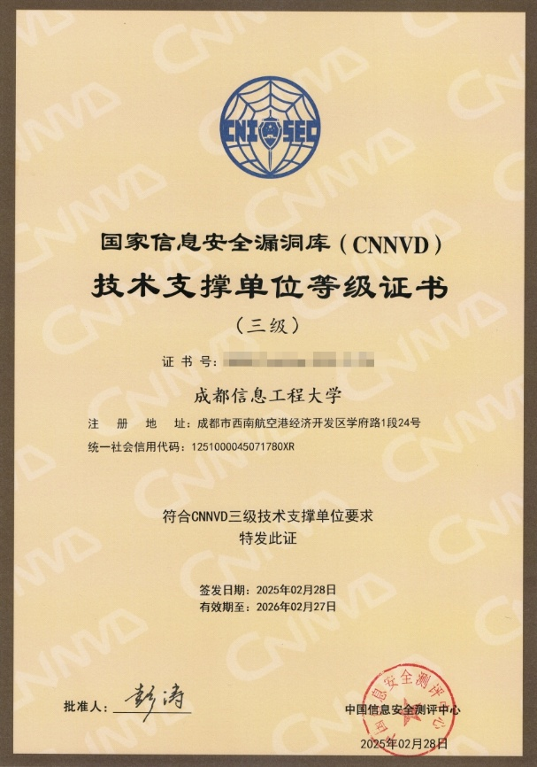 【本网讯】近日,在学校网络空间安全学院师生的共同努力下,我校凭借在信息安全领域的技术积累,通过中国信息安全测评中心审核,正式入选国家信息安全漏洞库(CNNVD)技术支撑单位(三级)。这一成就标志着悟空官方网站在漏洞挖掘、风险研判、安全防护等领域的技术实力获国家级认可,成为服务“网络强国”战略的“高校先锋”。