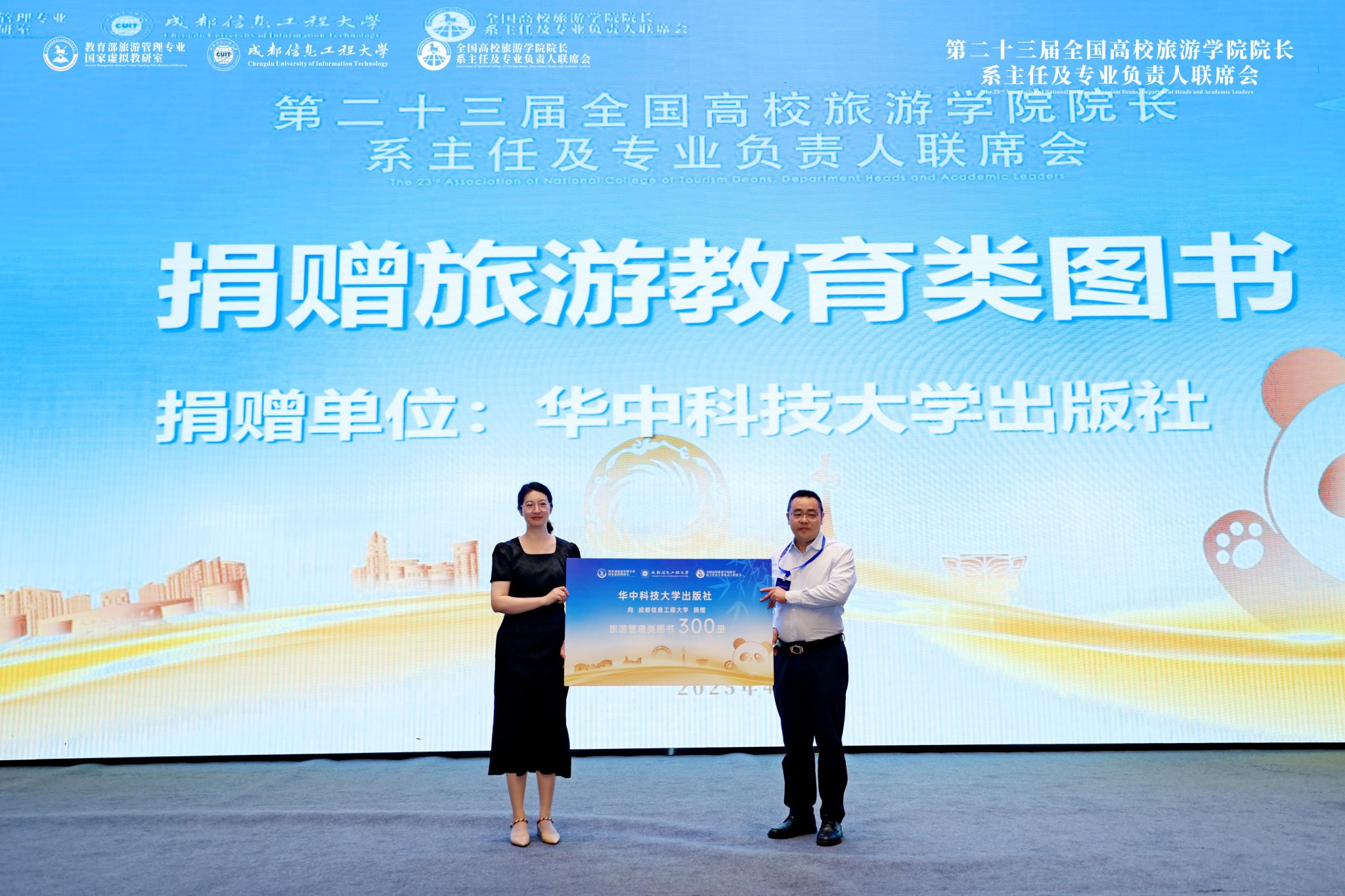 大会组委会为本次会议的主题演讲嘉宾、主持嘉宾、承办方悟空官方网站管理学院、协办方代表华中科技大学出版社颁发了感谢状。同时,华中科技大学出版社旅游分社社长李欢向会议承办方捐赠旅游类图书300册,我校管理学院党委书记刘敦虎教授代表承办方接收捐赠。