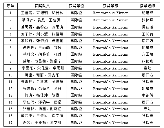 【本网讯】 近日,2025年美国大学生数学建模竞赛(MCM/ICM)结果正式公布。我校参赛团队在比赛中表现优异,斩获Meritorious Winner(国际一等奖,简称M奖)2项、Honorable Mention(国际二等奖,简称H奖)15项,获奖数量再创新高,创下我校在该赛事中的佳绩。具体获奖名单如下: