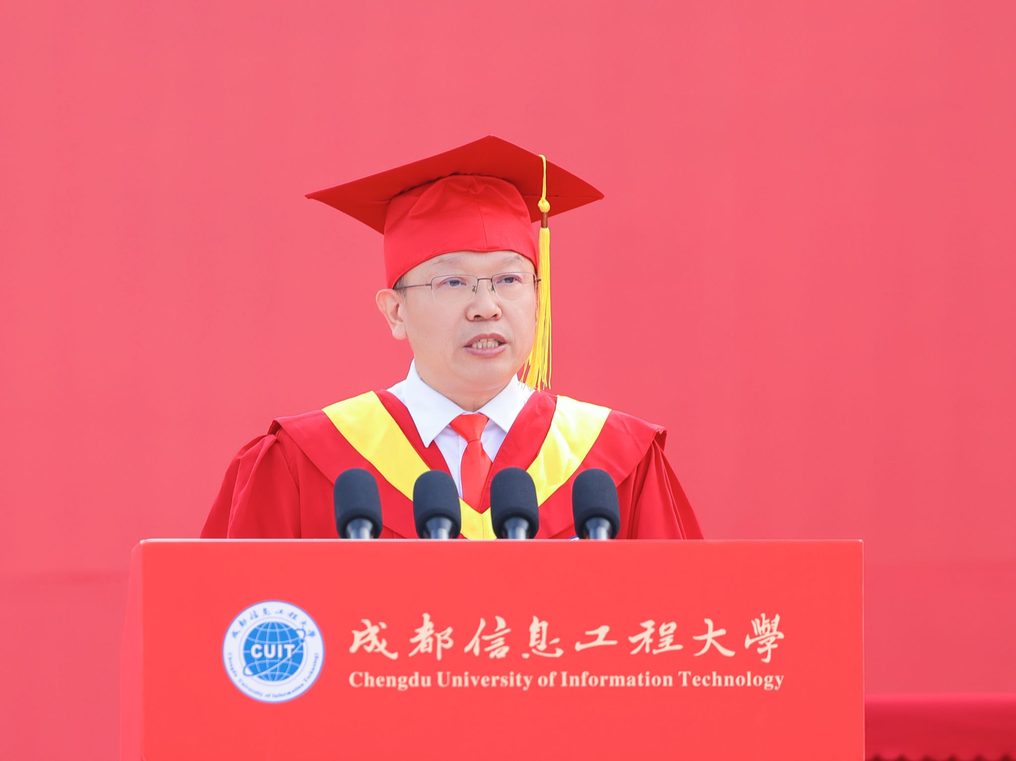 何建新在讲话中对全体毕业生寄予了三点希望,一是以定力为锚,在风雨洗礼中淬炼精神筋骨。定力是信仰与意志的熔铸,是“蓝图绘到底”的执着,“任尔风动”的从容,心火不灭的执着,暗夜秉烛的孤勇。愿你们涵养精神定力,在时代浪潮中锚定人生坐标。二是以自信为帆,在时代变局中开拓创新境界。高扬自信的风帆,在技术的洪流中勇往直前,既锚定学科深耕的“主航道”,更敢于在未知海域开辟“新坐标”。三是以笃行为楫,在文明长河中书写成信答案。将所学所思带入广阔天地,在行动中扎根、在服务中成长,在社会第一线写下属于自己的答案。