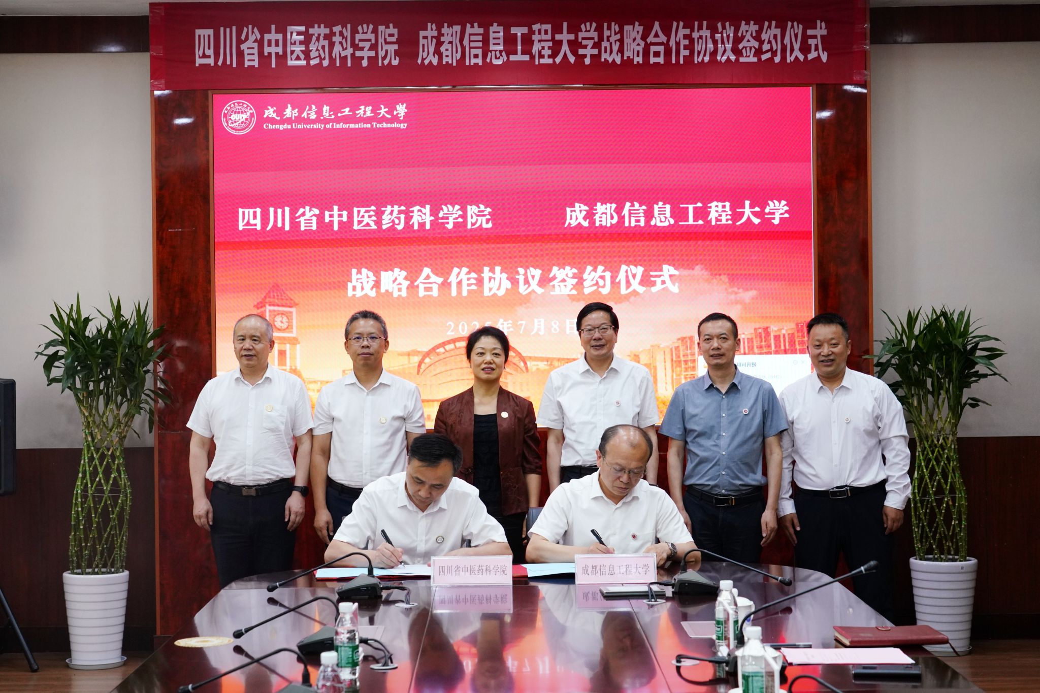 【本网讯】7月8日,四川省中医药科学院来校交流座谈。四川省中医药科学院党委书记徐旭,党委副书记、院长何本祥,党委委员、副院长张磊,学校党委书记沈火明,党委副书记、校长何建新,党委副书记杨奇才,党委常委、副校长舒红平参加座谈会。会议由舒红平主持。何本祥、何建新分别代表双方签署院校合作协议。