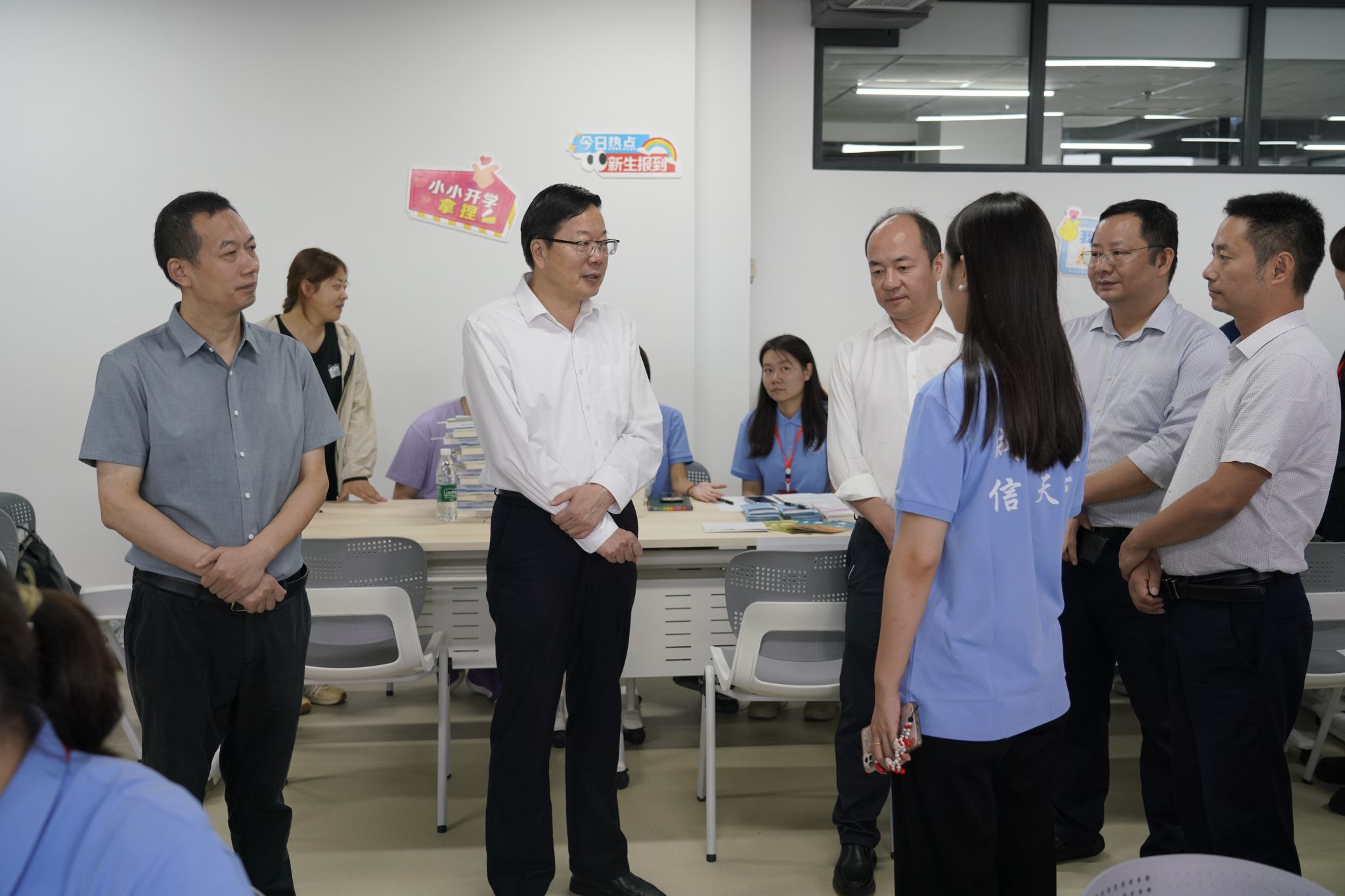 9月6日上午,学校党委书记沈火明、校长何建新、党委副书记杨奇才、副校长陈权亮分别在航空港和龙泉校区检查指导迎新工作,关心慰问一线的工作人员和志愿者,仔细询问了解迎新工作的开展情况。校领导们深入学院报到现场、学生公寓、学生食堂与新生和家长亲切交流、合影留念。