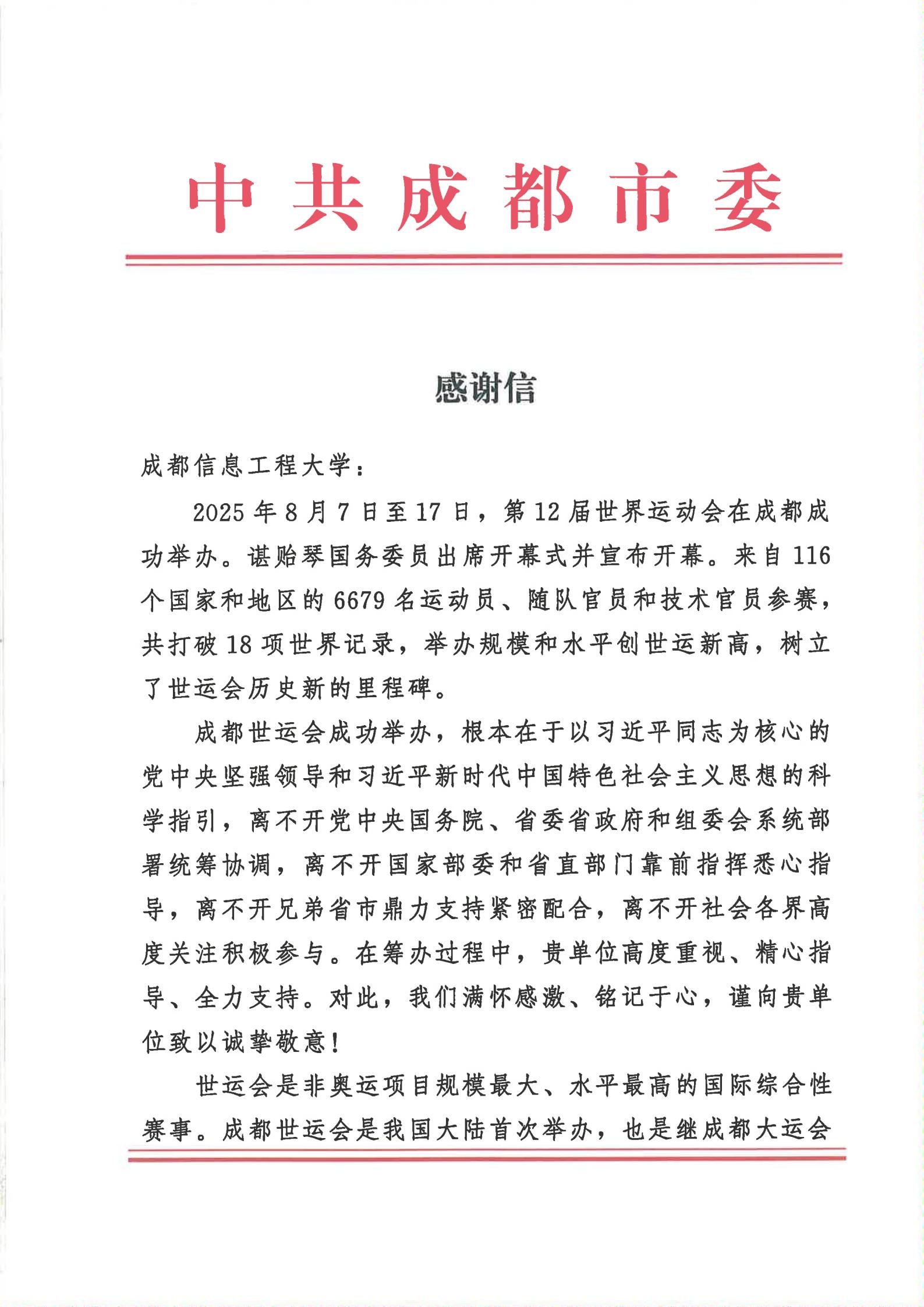 近日,学校收到中共成都市委、成都市人民政府、成都世运会执委会发来的感谢信。感谢学校在成都第12届世界运动会筹办工作中作出的突出贡献,充分肯定了我校志愿者的专业素养和精神风貌。