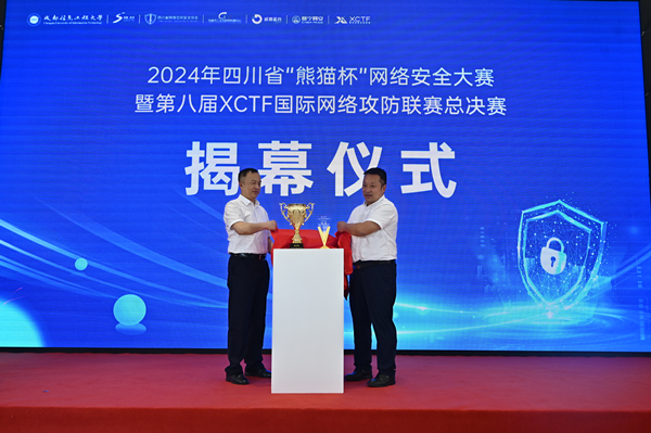 在开幕式现场,舒红平副校长与王志宇政委为2024年四川省“熊猫杯”网络安全大赛暨第八届XCTF国际网络攻防联赛总决赛揭幕。