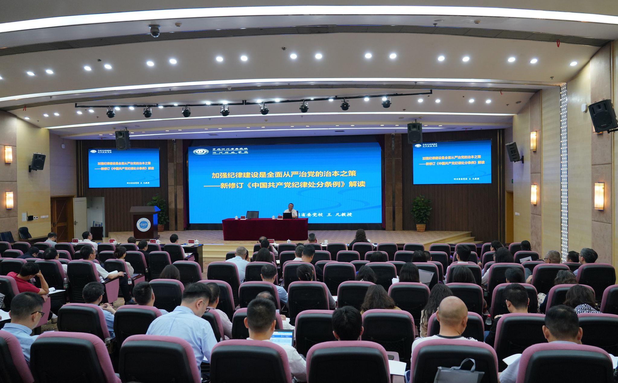 王凡教授以《加强纪律建设是全面从严治党的治本之策——新修订〈中国共产党纪律处分条例〉解读》为题,带领大家回顾了中国共产党百年来加强党的建设的光辉历程,提出了全面从严治党必须思想建党和制度治党紧密结合、一体推进。他指出,党在百年建设过程中形成了比较完善的党内法规制度体系,《中国共产党纪律处分条例》(以下简称《条例》)对维护党章和其他党内法规的贯彻执行具有十分重要的作用。王凡教授将理论和实践相结合,历史与现实相贯通,对《条例》修订的背景、意义以及《条例》11章158条内容进行了细致全面的解读,让广大领导干部深刻领会修订《条例》的重大意义,准确把握新修订《条例》的鲜明特点,全面准确理解《条例》的丰富内涵,进一步强化党纪党规意识。