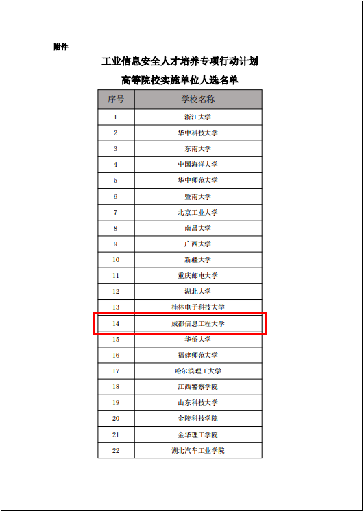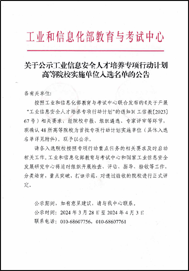 【本网讯】2024年3月,工业和信息化部教育与考试中心发布《关于公示工业信息安全人才培养专项行动计划高等院校实施单位入选名单的公告》。按照工业和信息化部教育与考试中心联合发布的《关于开展“工业信息安全人才培养专项行动计划”的通知》(工信教〔2023〕67号)相关要求,经院校申报、组织遴选、专家评审等环节,确认48所高等院校为首批专项行动计划实施单位。