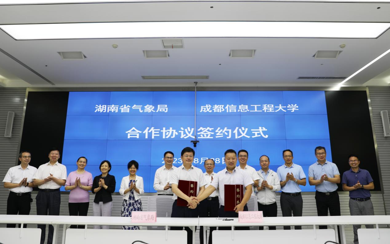 【本网讯】为进一步推进局校合作,8月28日,学校校长何建新、副校长舒红平一行到湖南省气象局走访调研。湖南省气象局党组书记、局长郑宏翔,党组成员、副局长曾建辉、陈媛陪同。双方签署了局校合作协议,并开展座谈交流。曾建辉、舒红平分别代表双方签署了局校合作协议。
