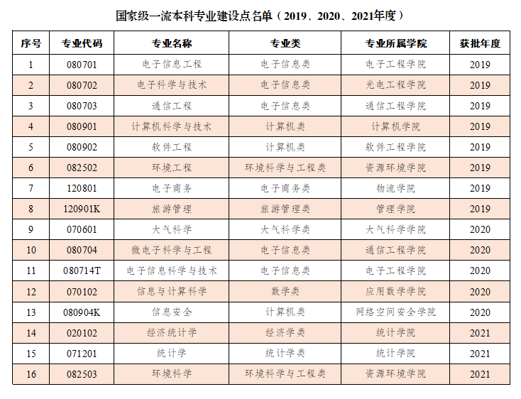 至此学校获批了电子信息工程、电子科学与技术、通信工程、计算机科学与技术、软件工程、环境工程、电子商务、旅游管理、大气科学、微电子科学与工程、电子信息科学与技术、信息与计算科学、信息安全、经济统计学、统计学、环境科学等16个国家级一流本科专业建设点,其中经济统计学、统计学、环境科学为2021年度新入选。获批自动化、网络工程、光电信息科学与工程、地理信息科学、应用气象学、会计学、应用物理学、数字媒体技术、电气工程及其自动化、测控技术与仪器、机械电子工程、空间信息与数字技术、英语、物联网工程、社会工作、物流管理、金融工程、数学与应用数学、遥感科学与技术、市场营销、人力资源管理等21个省级一流本科专业建设点,其中金融工程、数字与应用数学、遥感科学与技术、市场营销、人力资源管理为2021年度新入选。