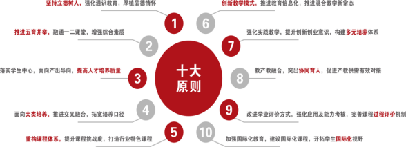 为了实现培养目标,2022版本科人才培养方案制修订工作将遵循“坚持立德树人,强化通识教育,厚植品德情怀”“推进五育并举,融通一二课堂,增强综合素质”“落实学生中心,面向产出导向,提高人才培养质量”“面向大类培养,推进交叉融合,拓宽培养口径”“重构课程体系,提升课程挑战度,打造行业特色课程”“创新教学模式,推进教育信息化,推进混合教学新常态”“强化实践教学,提升创新创业意识,构建多元培养体系”“深化科教产教融合,突出协同育人,促进产教供需有效对接”“改进学业评价方式,强化应用及能力考核,完善课程过程评价机制”“加强国际化教育,建设国际化课程,开拓学生国际化视野”十大原则,持续改进、持续完善人才方案,稳步提升人才培养质量。