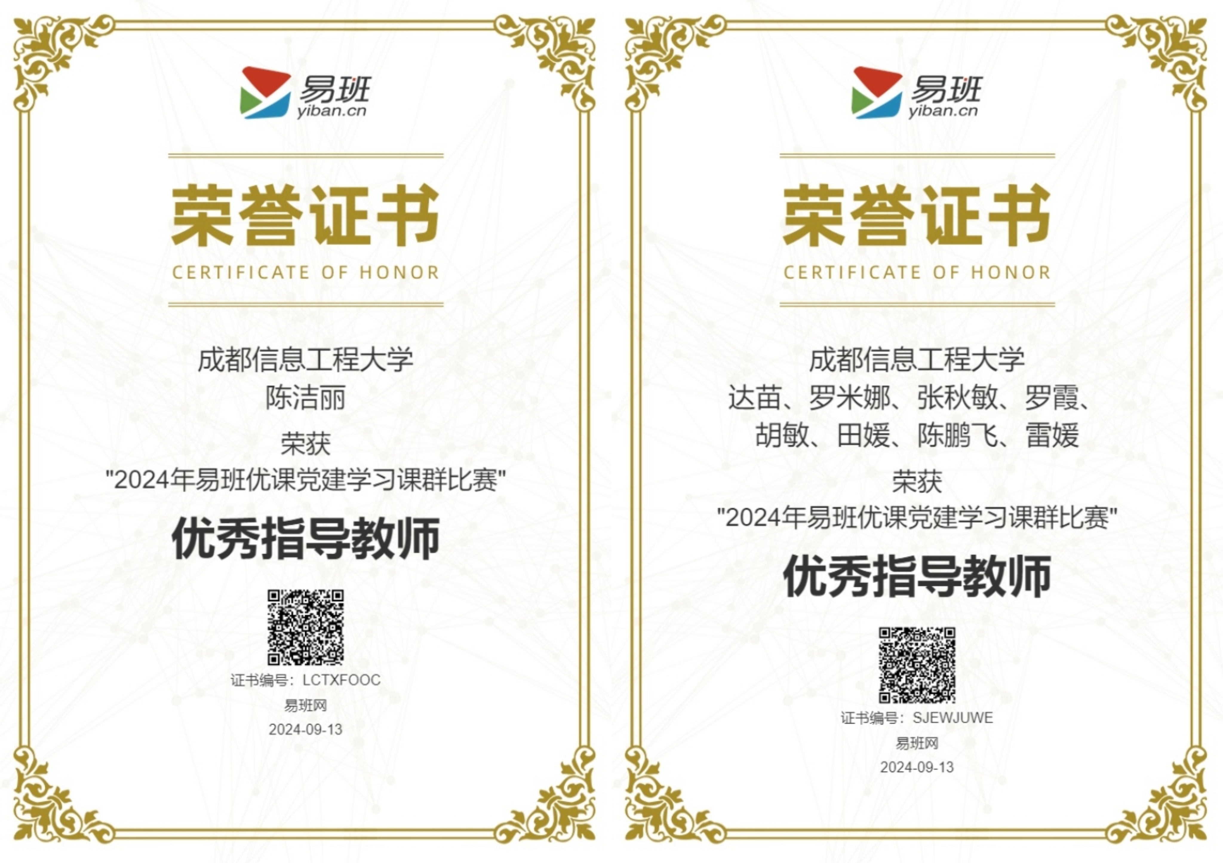 我校易班指导教师陈洁丽、达苗、罗米娜、张秋敏、罗霞、胡敏、田媛、陈鹏飞、雷媛荣获“2024年易班优课党建学习课群比赛”优秀指导教师荣誉。