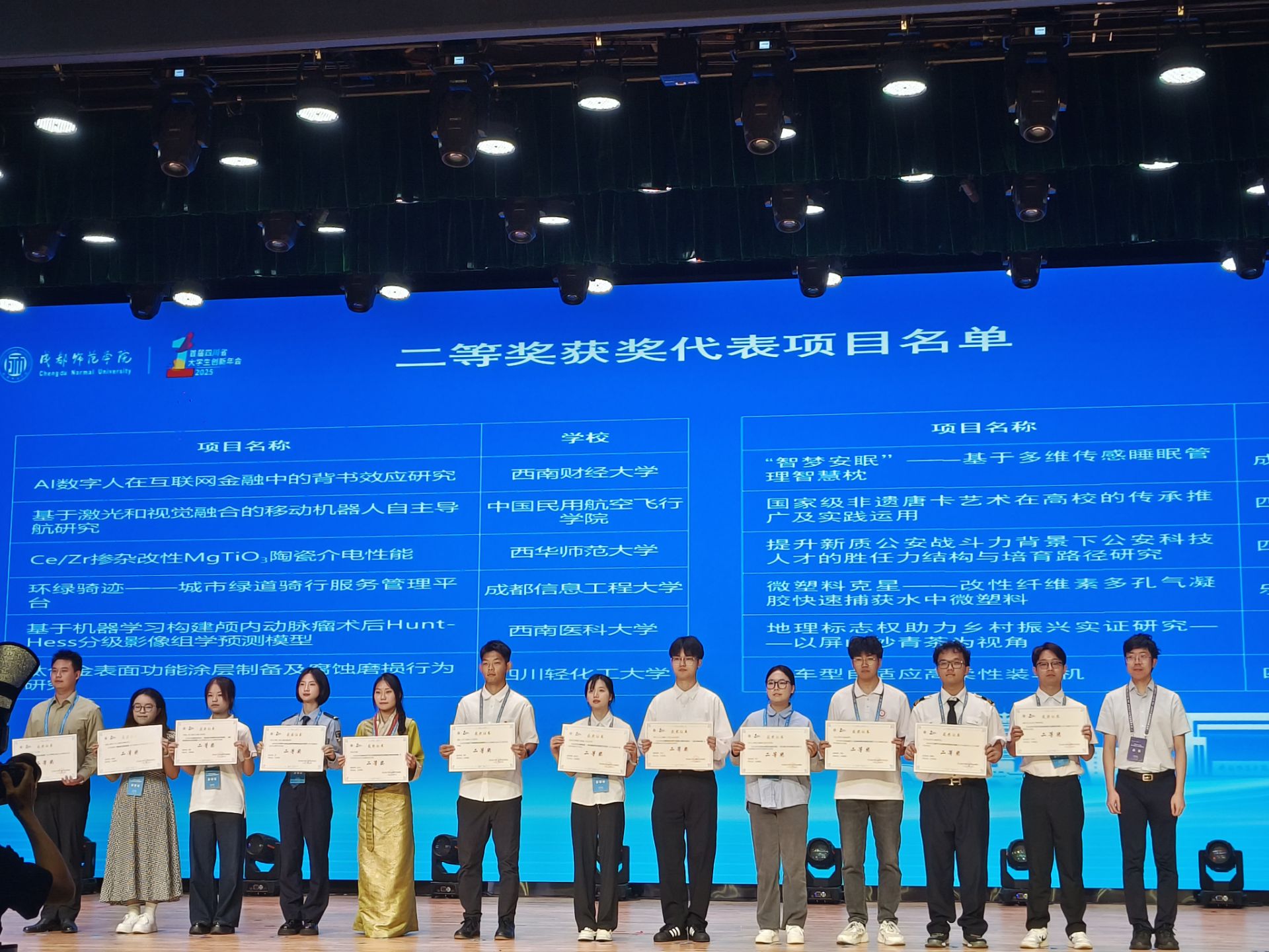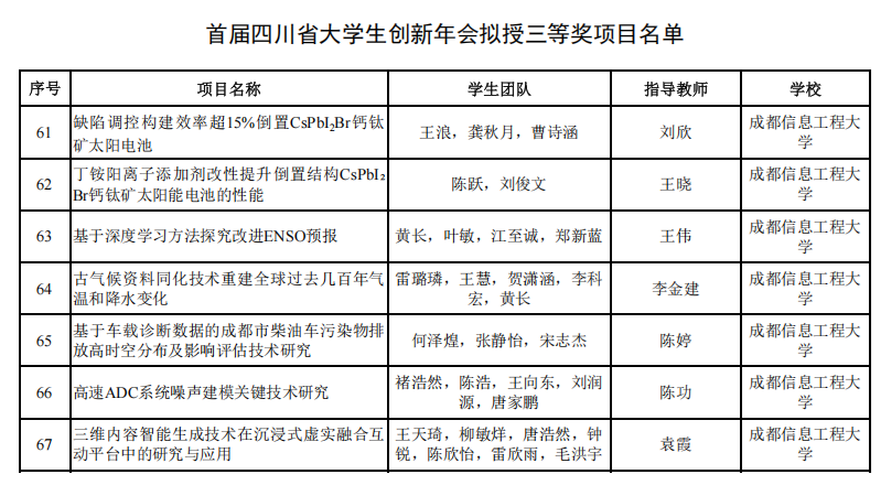 【本网讯】7月4日至6日,由省教育厅主办、成都师范学院承办的首届四川省大学生创新年会(主题“创享无限实践有为”)在成都师范学院温江校区举行。我校推荐的12个参赛项目中,8个项目斩获佳绩。其中,资源环境学院褚永彬指导的《环绿骑迹—城市绿道骑行服务管理平台》(团队成员蒲萍等5人)聚焦绿色出行,以智能化优化服务管理,获二等奖;光电工程学院刘欣、王晓,大气科学学院王伟、李金建,资源环境学院陈婷,通信工程学院陈功,计算机学院袁霞指导的7个项目获三等奖,展现了我校师生的创新创业实力。