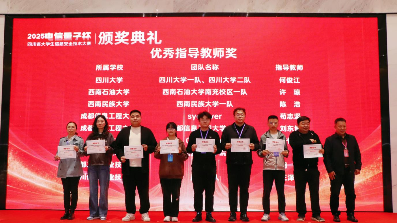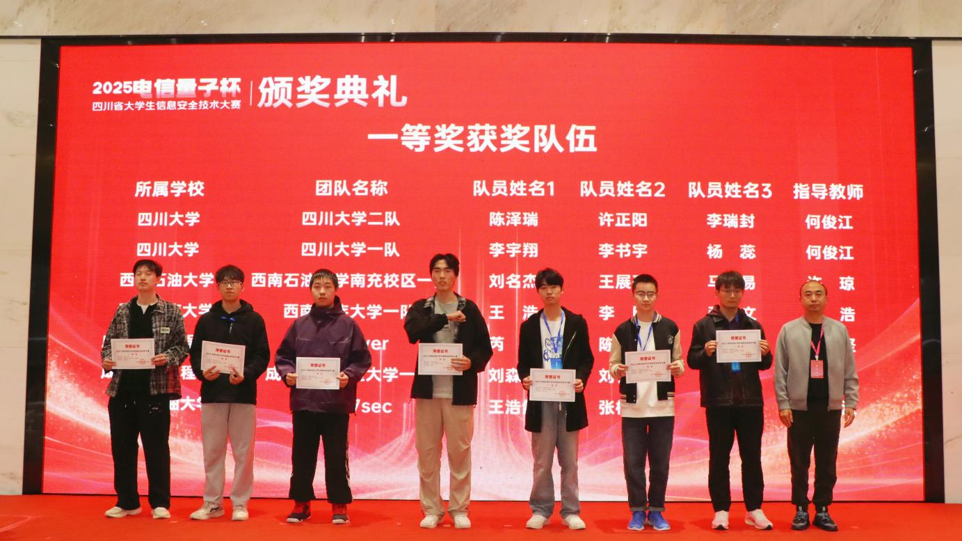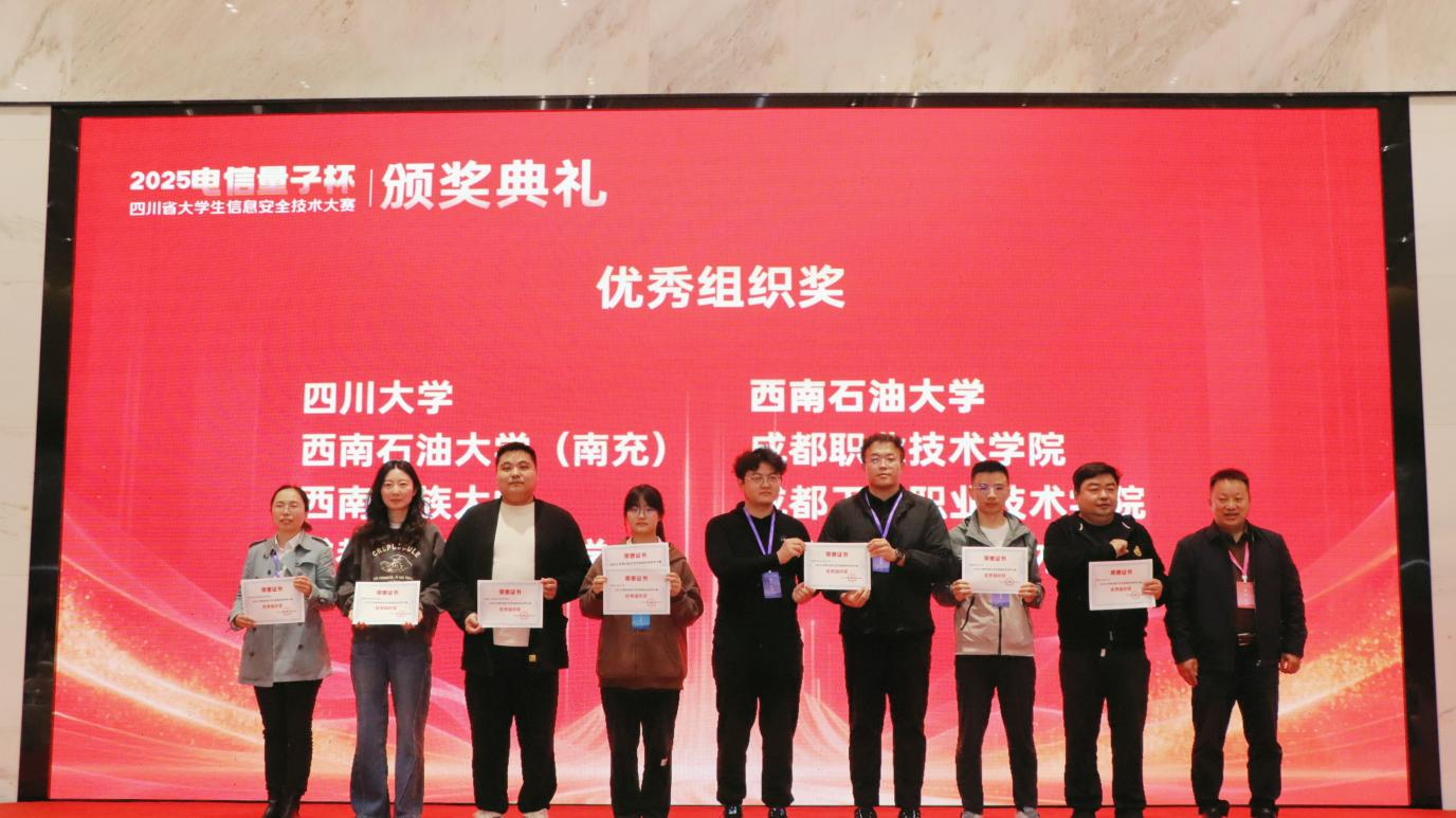 10月26日下午,大赛颁奖典礼在学校双流新型产业学院举行。学校副校长舒红平、中共四川省委网信办网络安全处处长魏杰、四川省公安厅反诈中心主任李文德、中国电信股份有限公司双流区分公司副总经理郑宇、南京赛宁信息技术有限公司总经理高庆官、四川省网络空间安全协会副理事长周成龙以及学校相关部门领导和嘉宾出席了颁奖典礼。