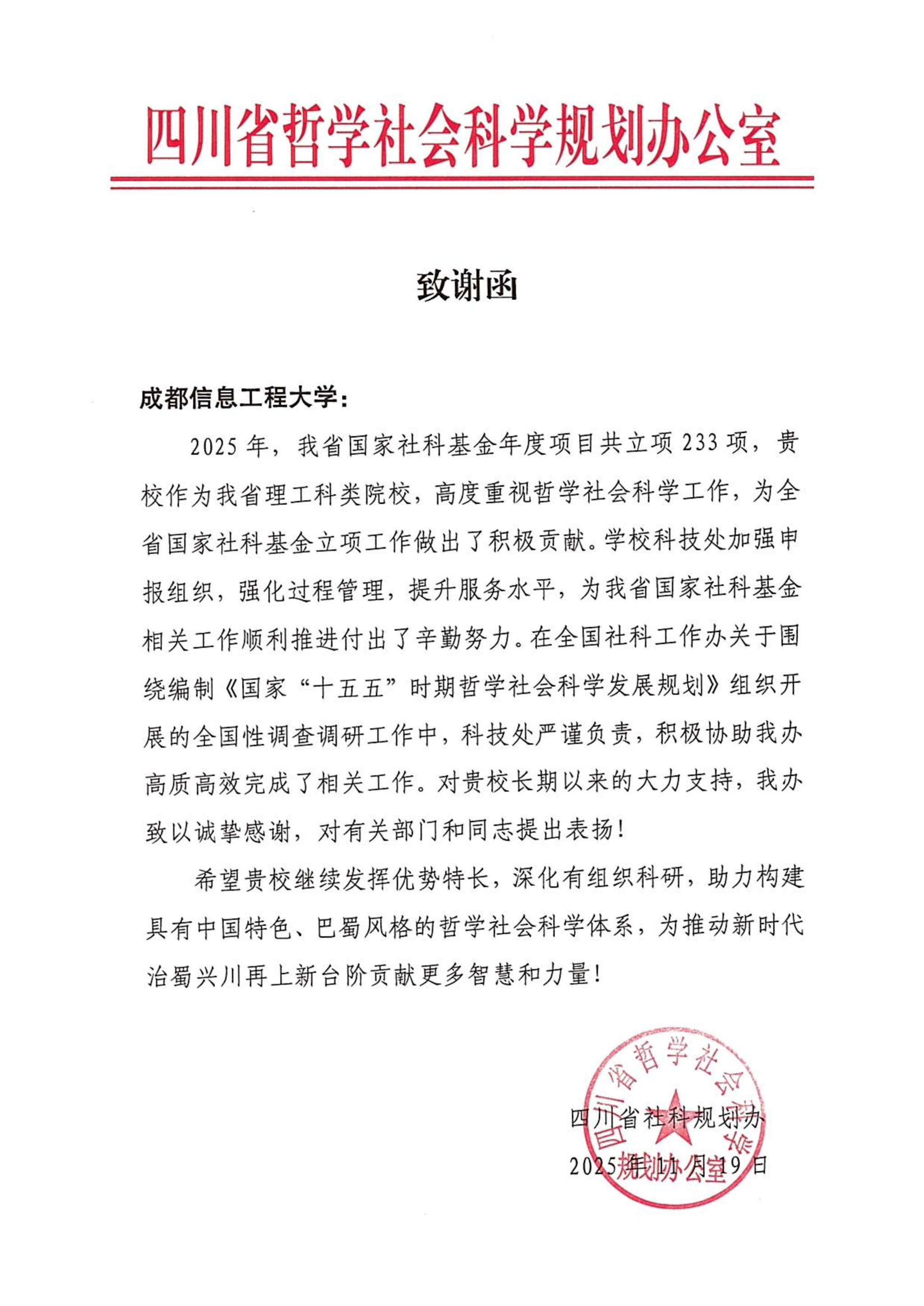 【本网讯】近日,四川省哲学社会科学规划办公室向我校发来感谢信,对我校在2025年国家“十五五”时期哲学社会科学发展规划全国性调查调研工作中作出的积极贡献表示衷心感谢,并对学校科技处及统计学院相关同志的辛勤付出予以表扬。